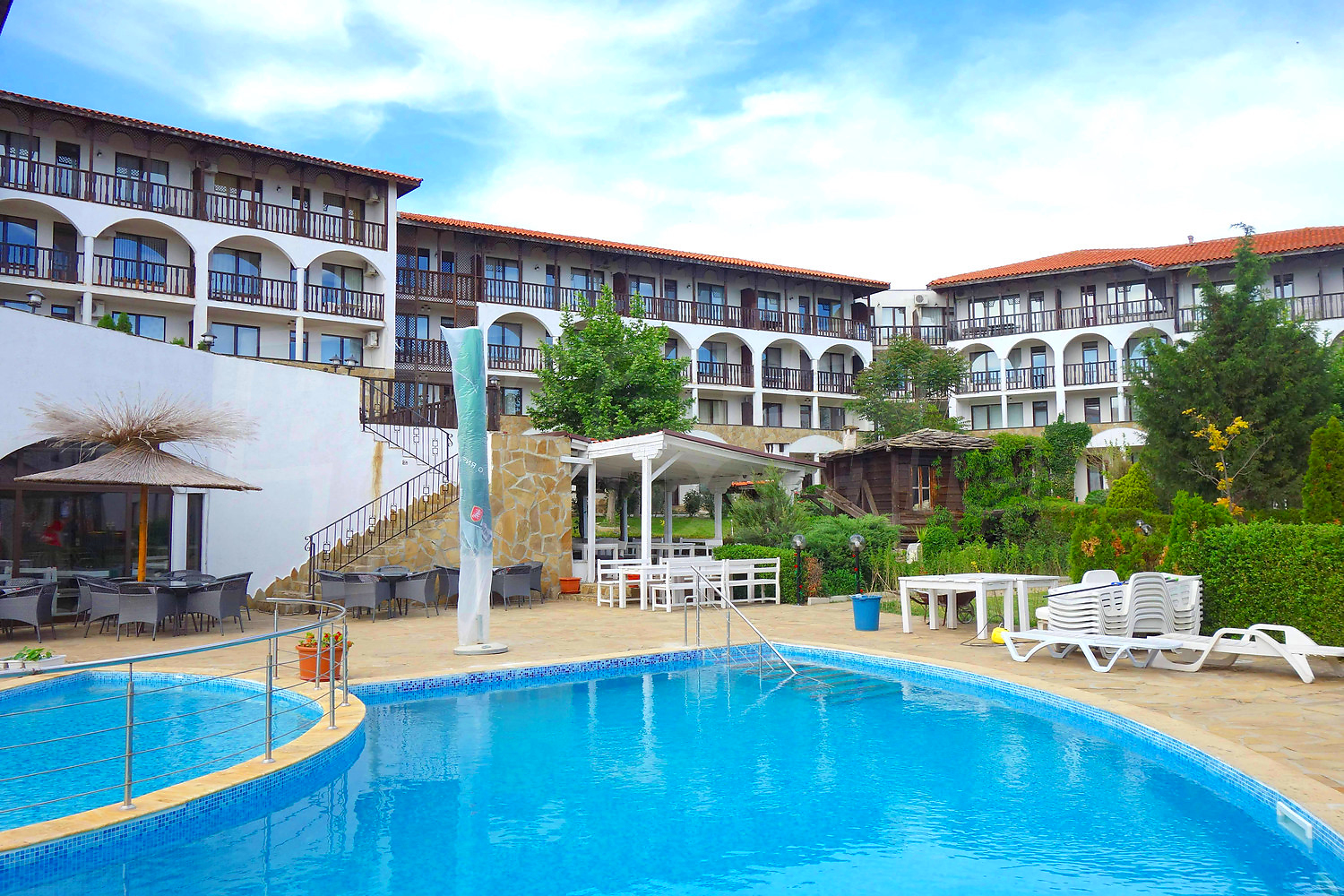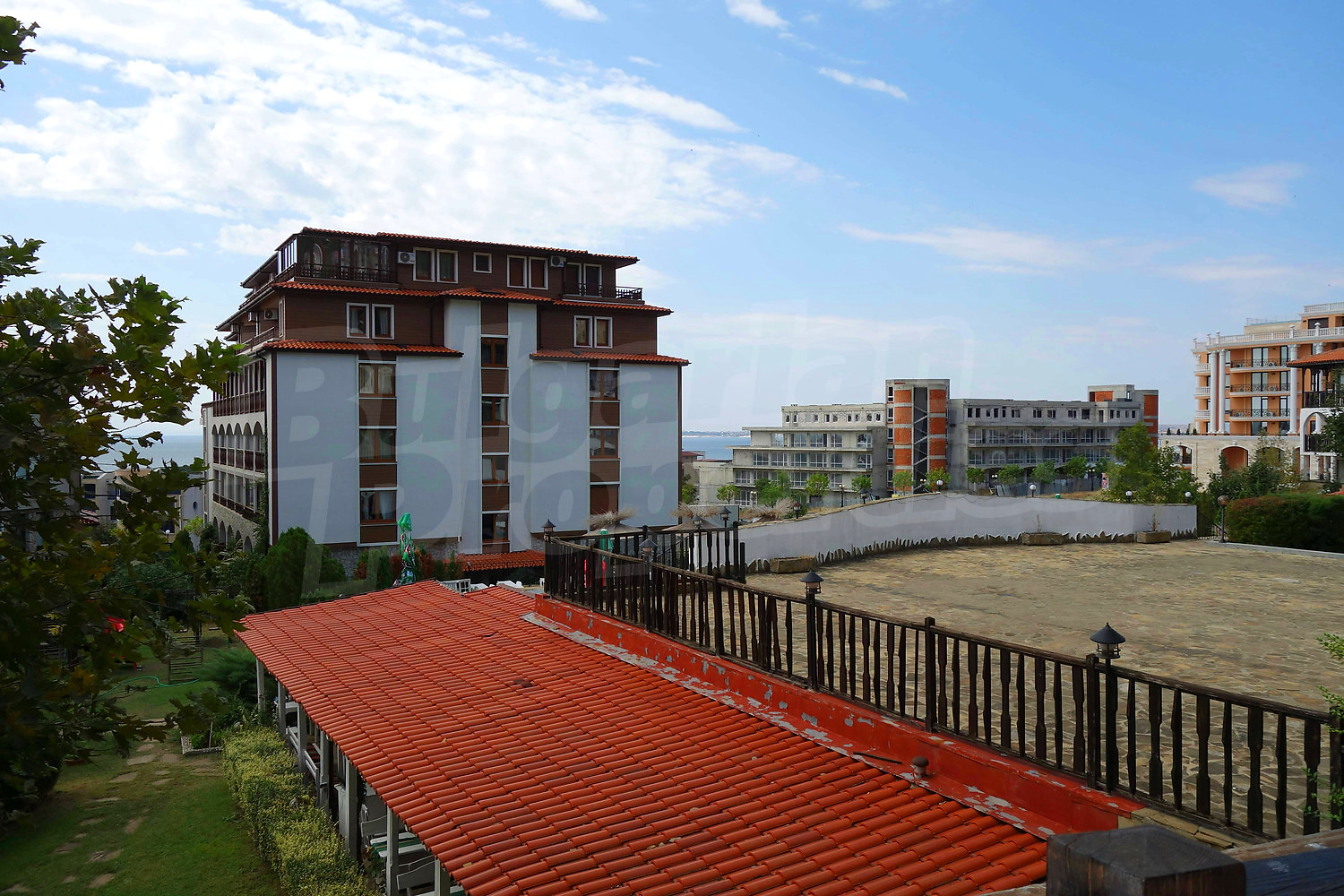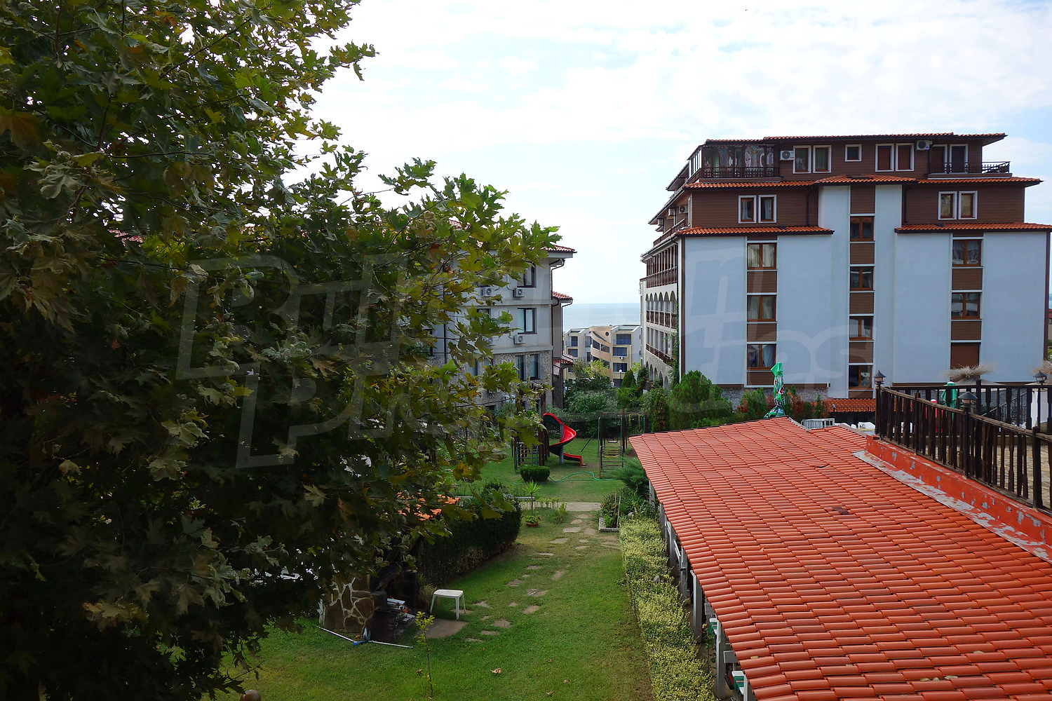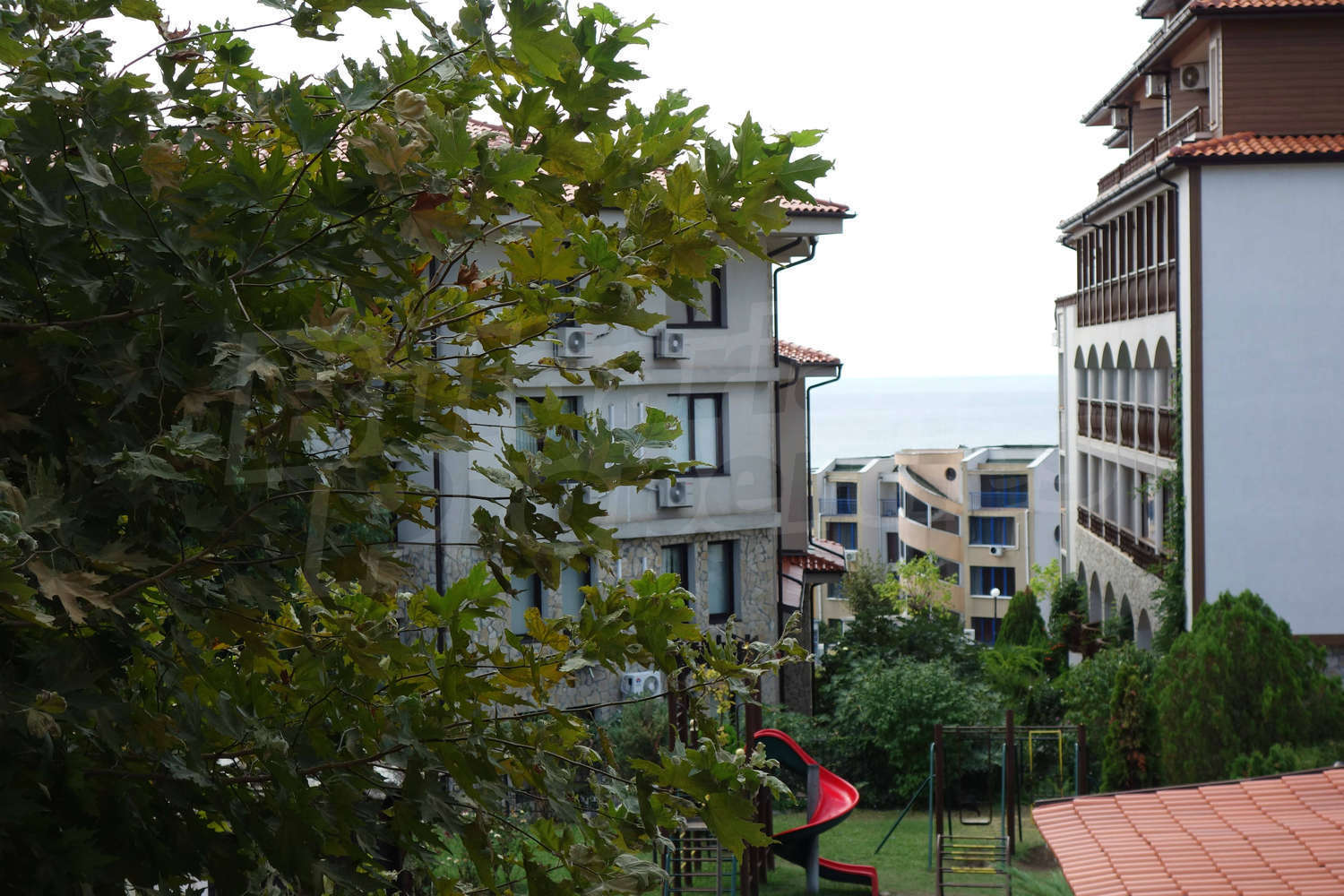 • един балкон с гледка към вътрешния двор на комплекса и морета.