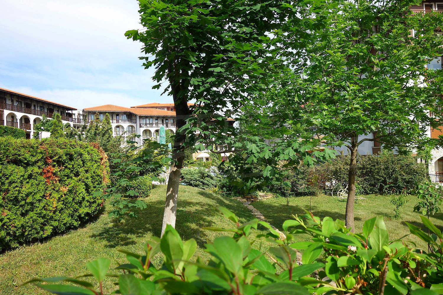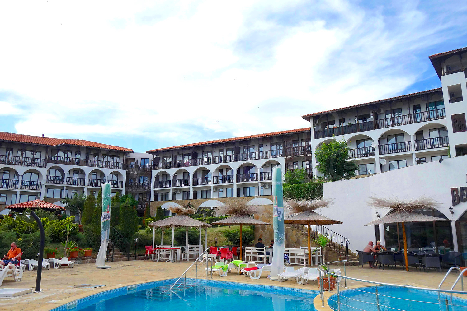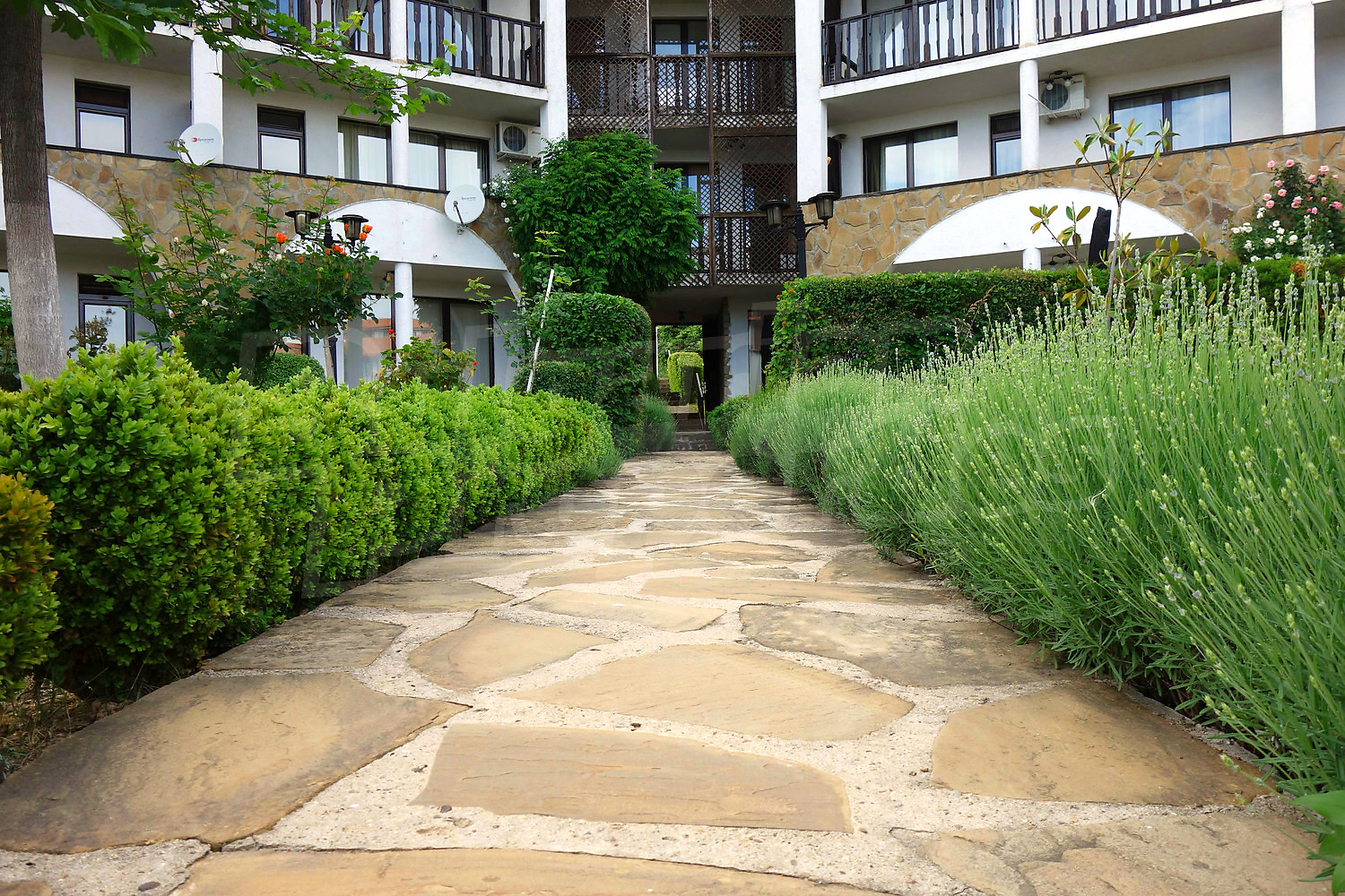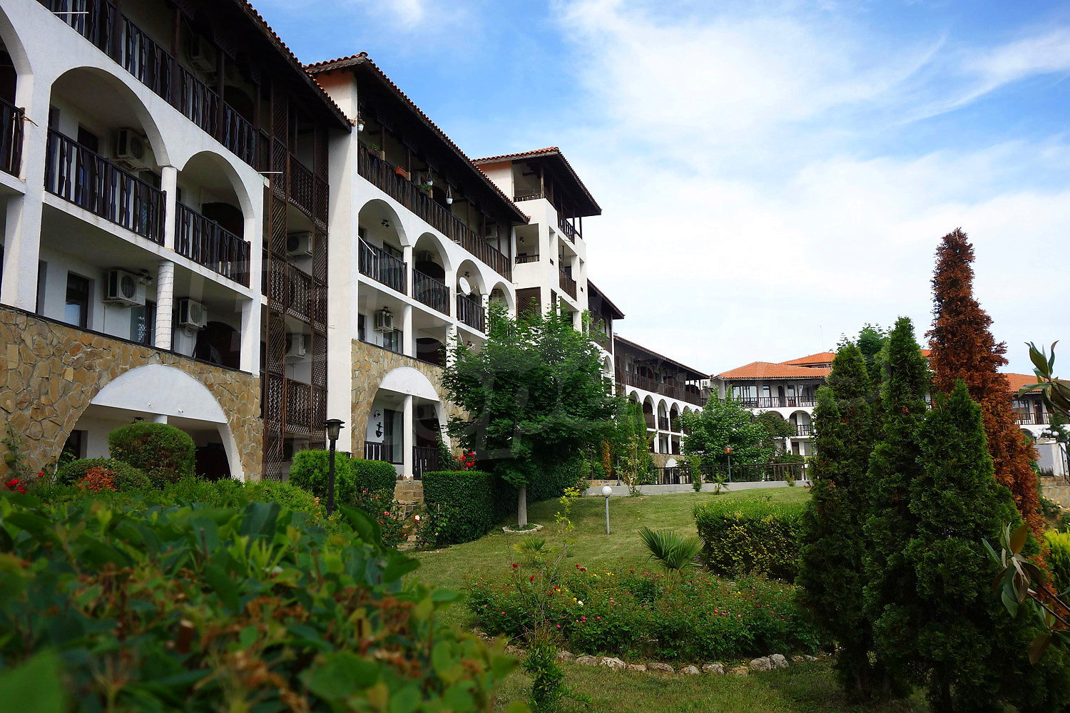 • един балкон с гледка към вътрешния двор на комплекса и морета.