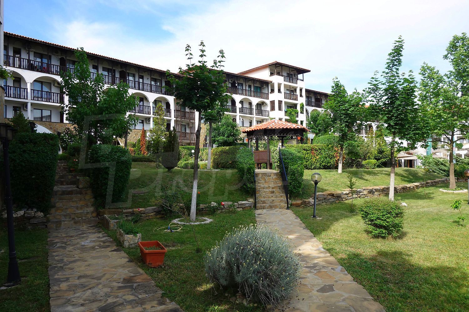 • един балкон с гледка към вътрешния двор на комплекса и морета.