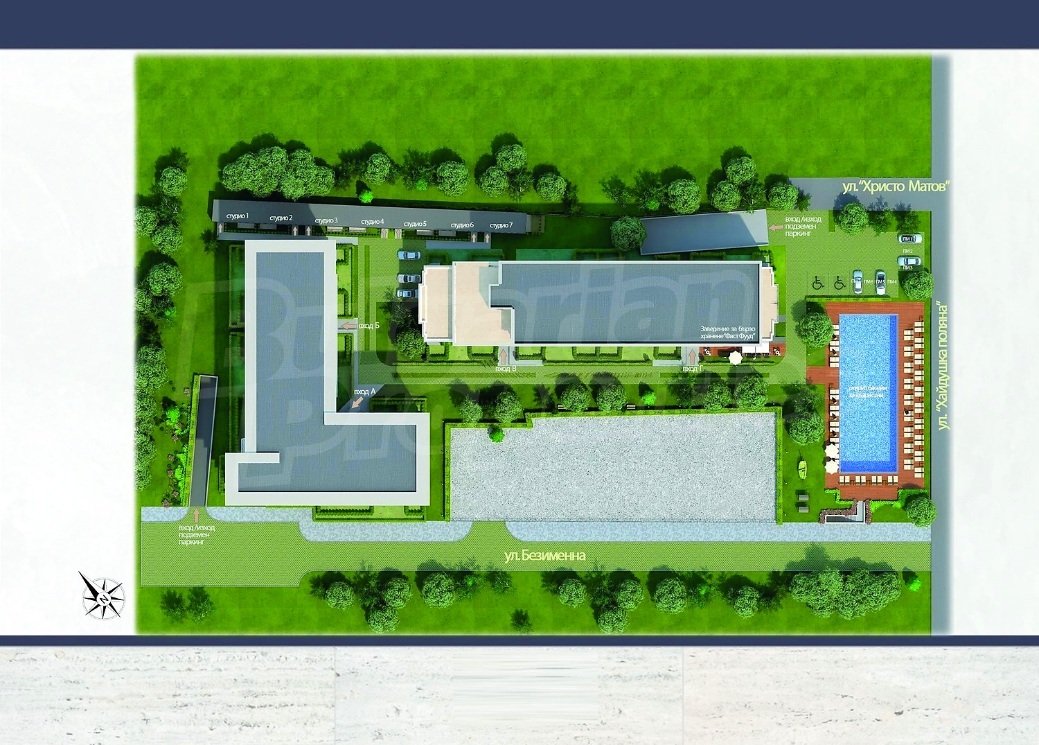 Предвидени са за изграждане две сгради: едната е Т-образна, разположена в северозападната част на имота с входове „А“ и „Б“, а другата е разположена централно в имота с входове „В“ и „Г“. На североизточната граница на имота е разположена едноетажна сграда със седем студиа.