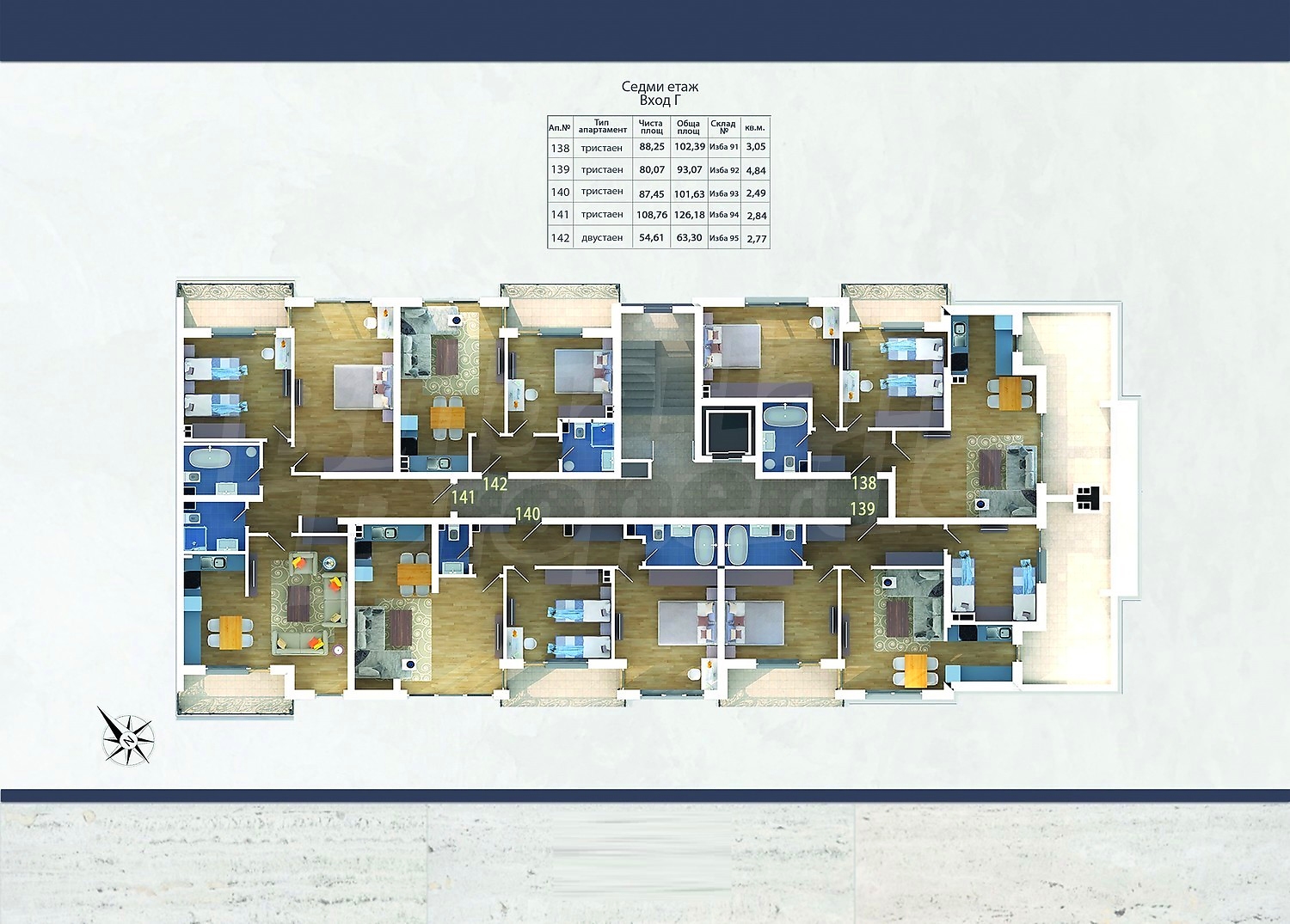 Във вход „А“ са предвидени 39 броя апартаменти, единият от които за хора с увреждания, във вход „Б“ – 43 броя, във вход „В“ са проектирани 28 апартамента и 3 ателиета, а във вход „Г“ – 32 апартамента и 2 ателиета. Пред всички апартаменти, ателиета и студия разположени на първите етажи има отделени открити озеленени тераси.
