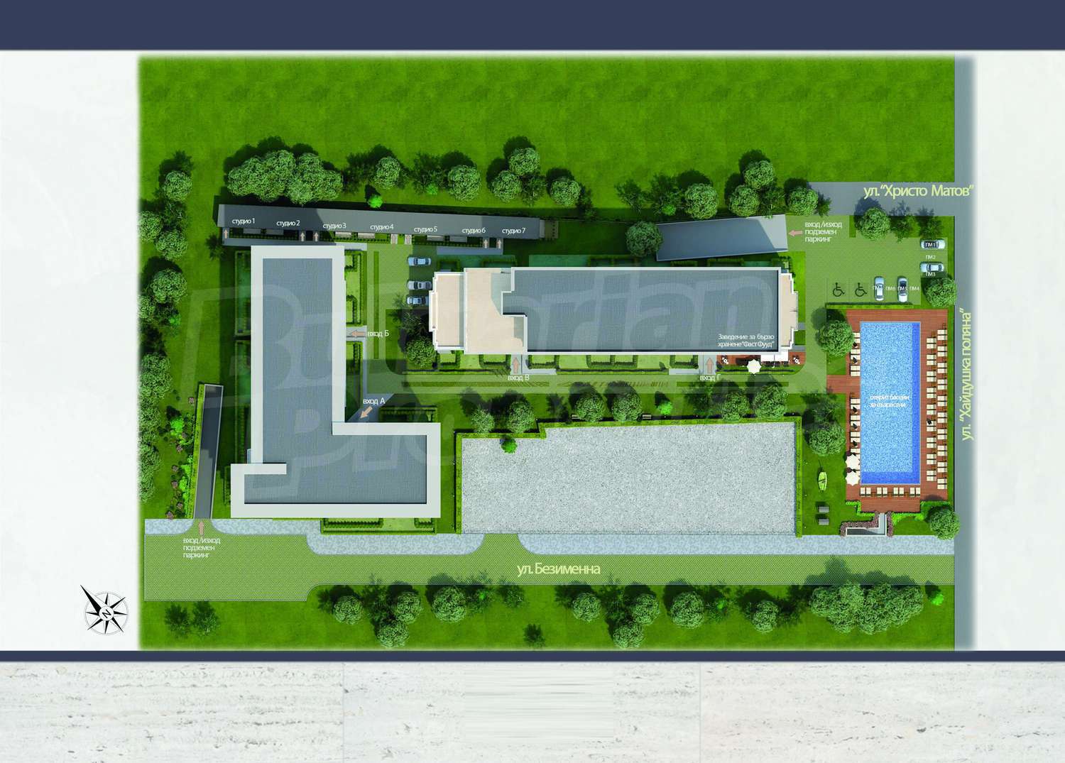 Предвидени са за изграждане две сгради: едната е Т-образна, разположена в северозападната част на имота с входове „А“ и „Б“, а другата е разположена централно в имота с входове „В“ и „Г“. На североизточната граница на имота е разположена едноетажна сграда със седем студиа.