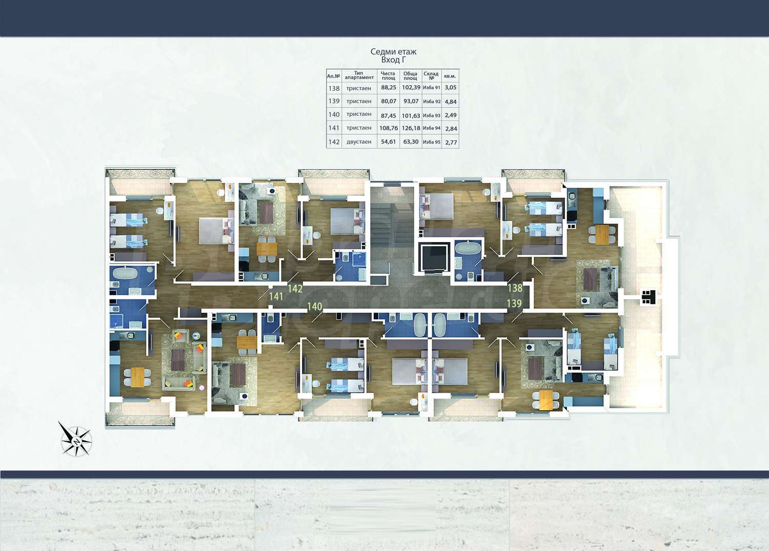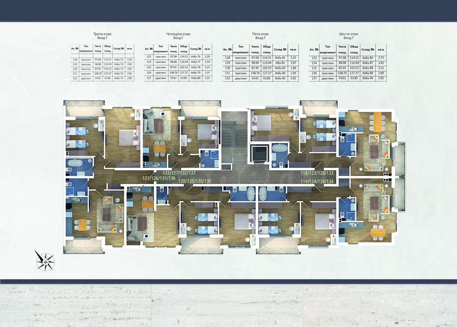 Във вход „А“ са предвидени 39 броя апартаменти, единият от които за хора с увреждания, във вход „Б“ – 43 броя, във вход „В“ са проектирани 28 апартамента и 3 ателиета, а във вход „Г“ – 32 апартамента и 2 ателиета. Пред всички апартаменти, ателиета и студия разположени на първите етажи има отделени открити озеленени тераси.