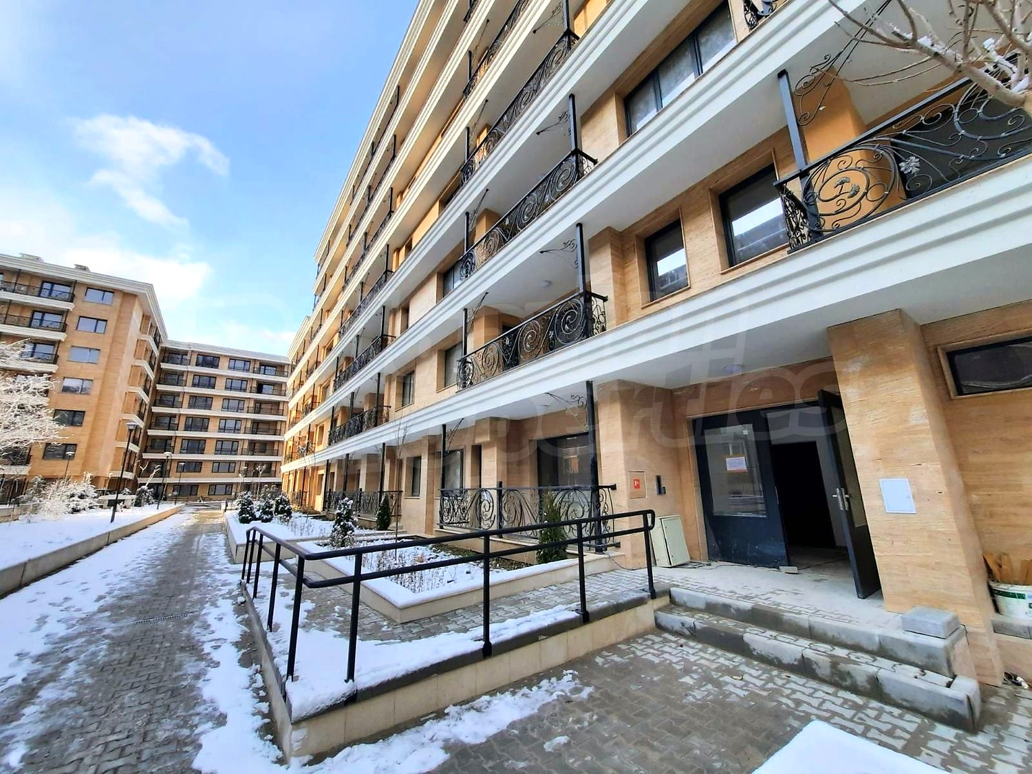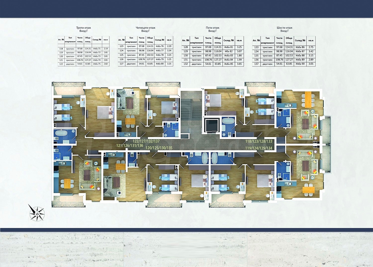 Във вход „А“ са предвидени 39 броя апартаменти, единият от които за хора с увреждания, във вход „Б“ – 43 броя, във вход „В“ са проектирани 28 апартамента и 3 ателиета, а във вход „Г“ – 32 апартамента и 2 ателиета. Пред всички апартаменти, ателиета и студия разположени на първите етажи има отделени открити озеленени тераси.