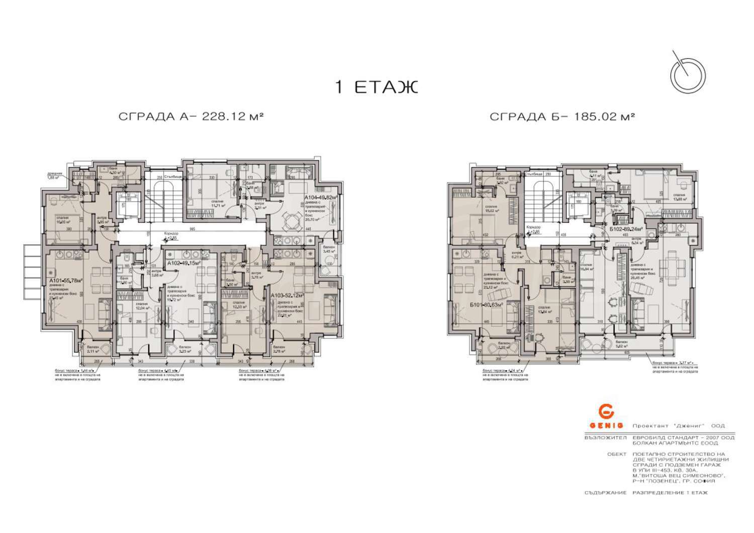 Имотът е разположен на 2/5 етаж (първи над партер) с площ от 101.86 кв.м. (нетна площ 89.24 кв.м. + общи части 12.62 кв.м. + тераса от 4.45 кв. м.), разпределена между: