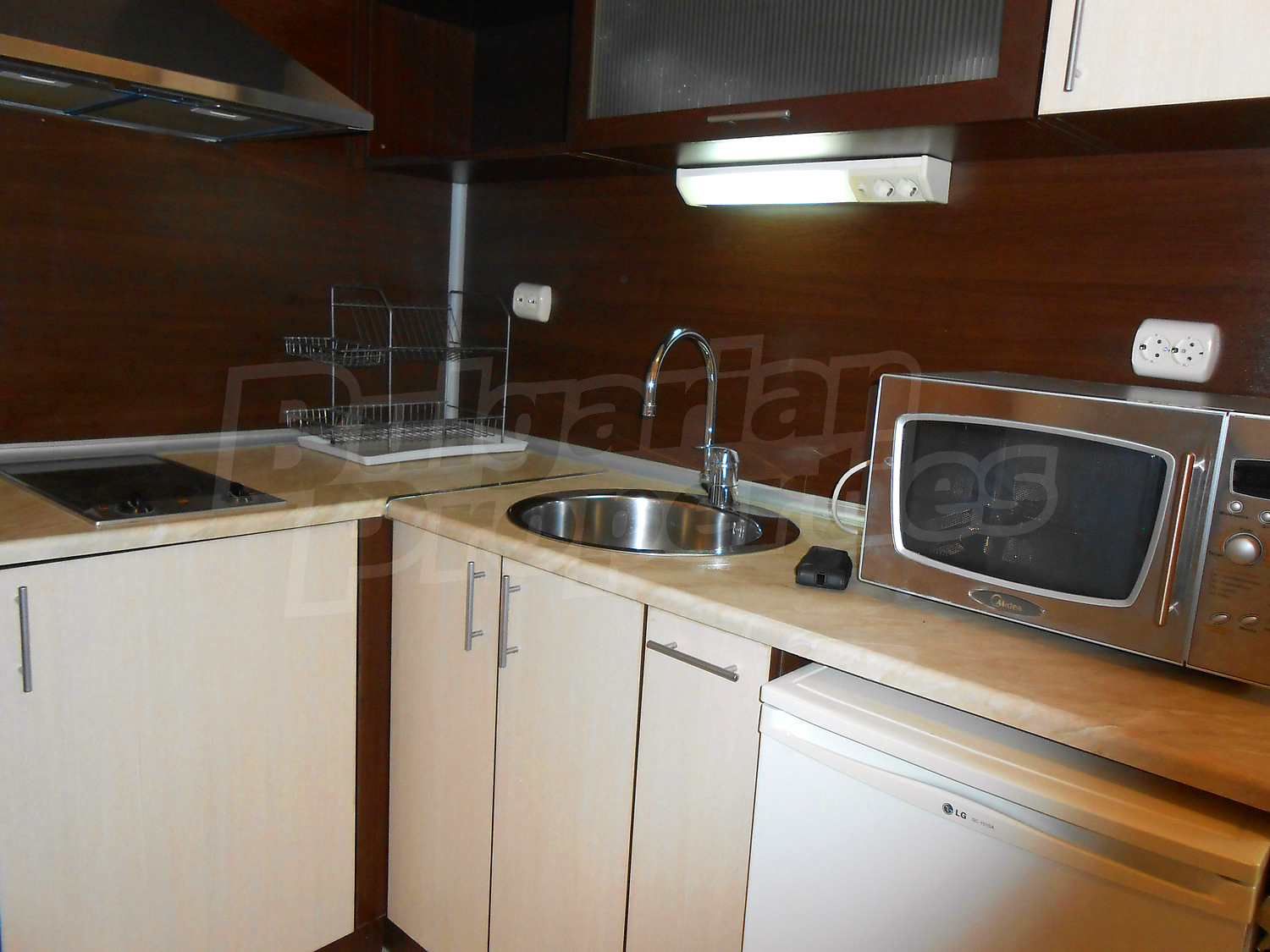 • Кухня – мивка, керамични котлони, аспиратор, фурна, микровълнова печка, хладилник