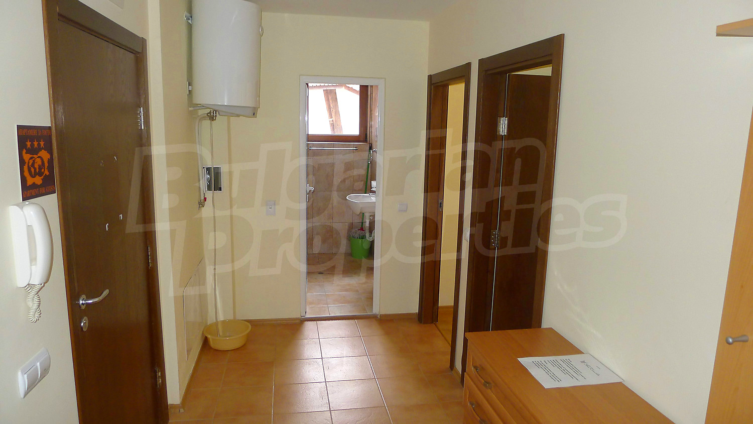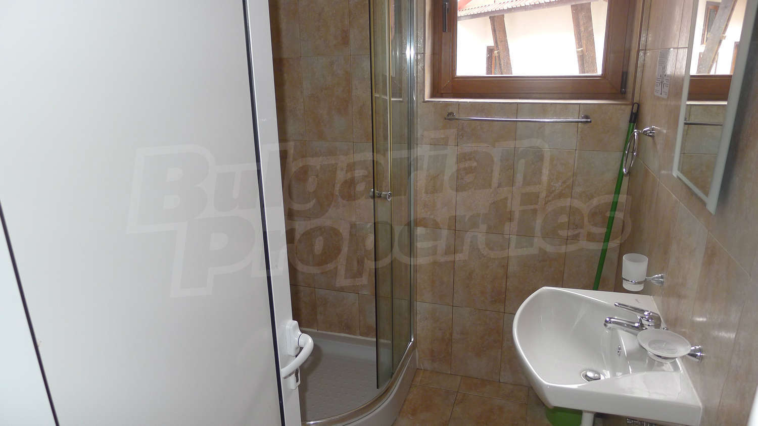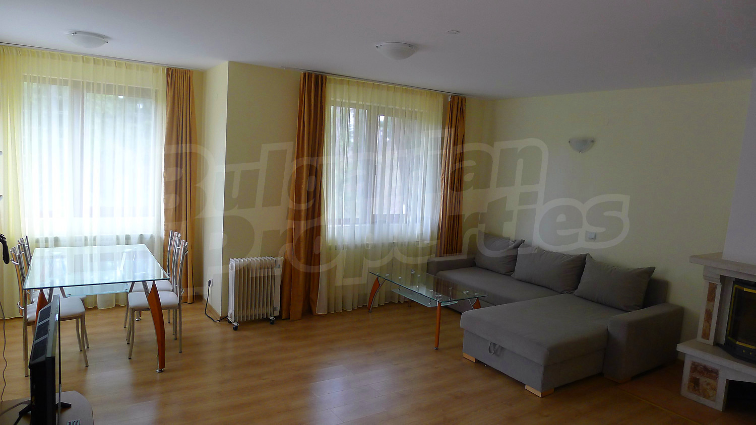 Апартаментът се разпределя между всекидневна с камина за допълнителен уют и кухненски бокс, 2 спални, баня с тоалетна, балкон. Пълното обзавеждане и оборудване може да разгледате на снимките. Отоплението е чрез електрически радиатори, в допълнение към камината. Подовите настилки са ламинат и теракот, а дограмата на прозорците – PVC.