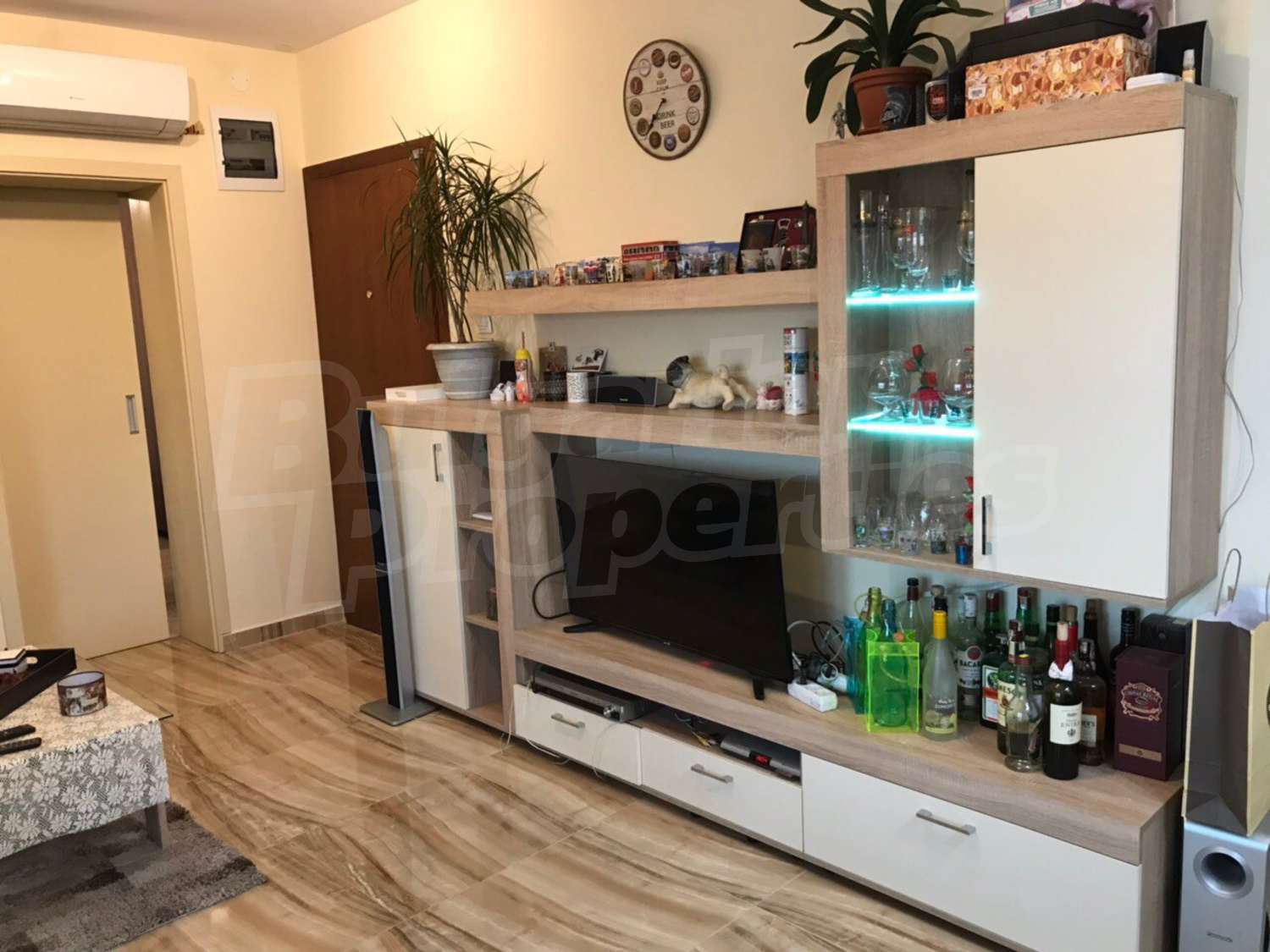 Интериорът е решен в светли, бежови тонове превъплъщение на спокойствието на домашния уют. Апартаментът се продава напълно обзаведен. Кухненски бокс с кухненски шкафове, необходимите електроуреди, трапезна маза със столове, диван, холна масичка и секция. Две спални с големи легла с нощни шкафчета и гардероби. Напълно обзаведена баня с луксозна санитария.