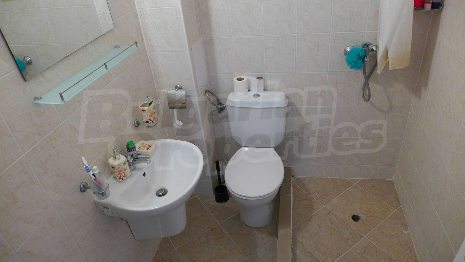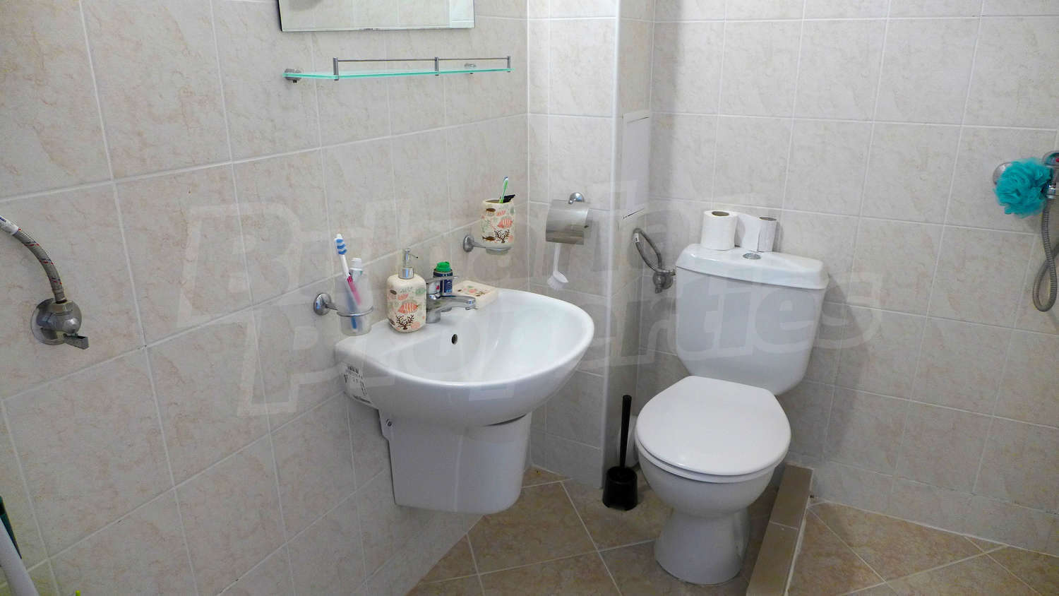 • Банята с тоалетна – с душ кабина, мивка с огледало
