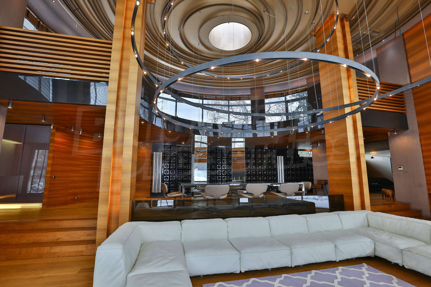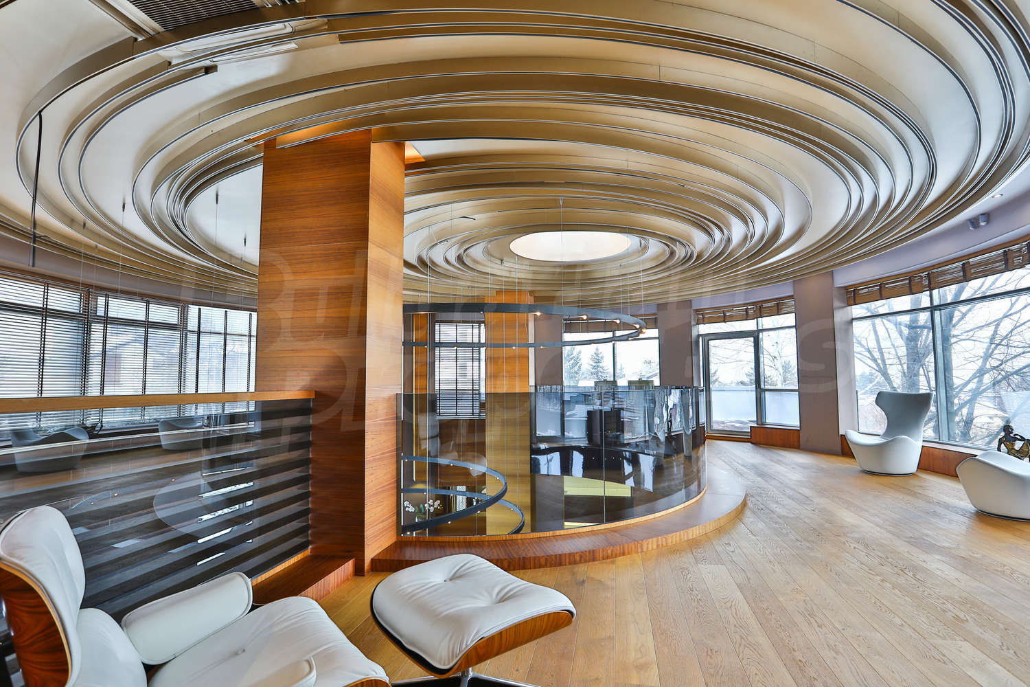 Предизвикателството при формирането на визията е било голямо не само заради мащаба от около 700 кв.м. надземна площ, но и поради вида на сградата, щедро отворена към външната среда с огромни витрини. Тя е завършена в края на 90-те години и е забележителна както с пропорциите си, така и със своя характер. Пространствата преливат от голямо към малко и отново голямо, като водят към един център. Къщата представлява цилиндър с остъкляване от всички страни и с горно осветление, точно маркиращо сърцето на дома.