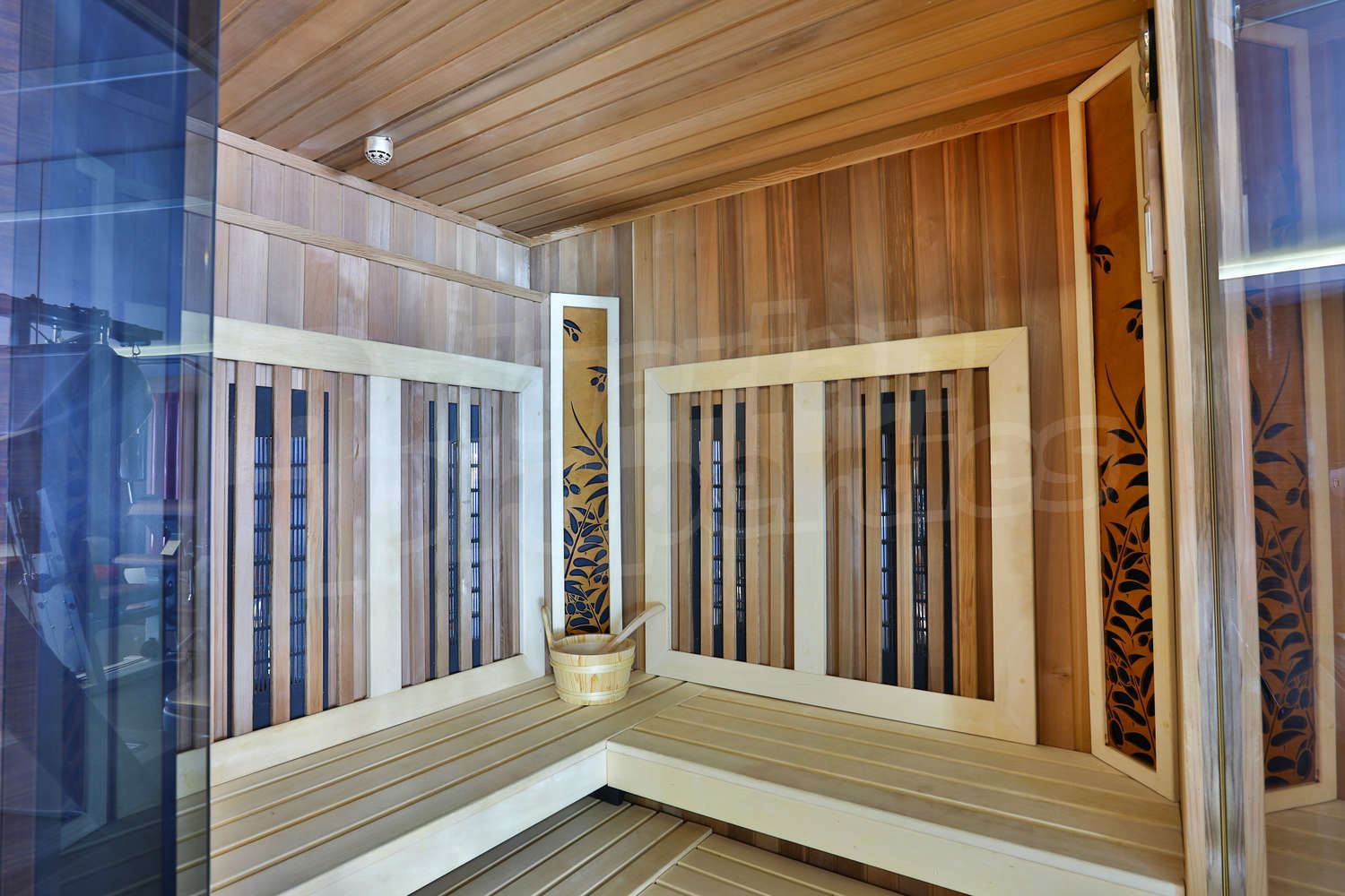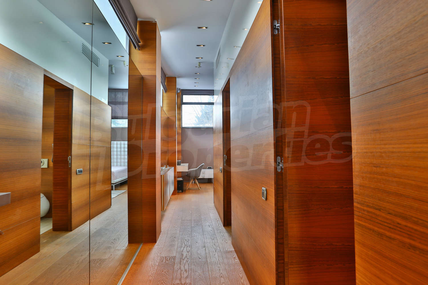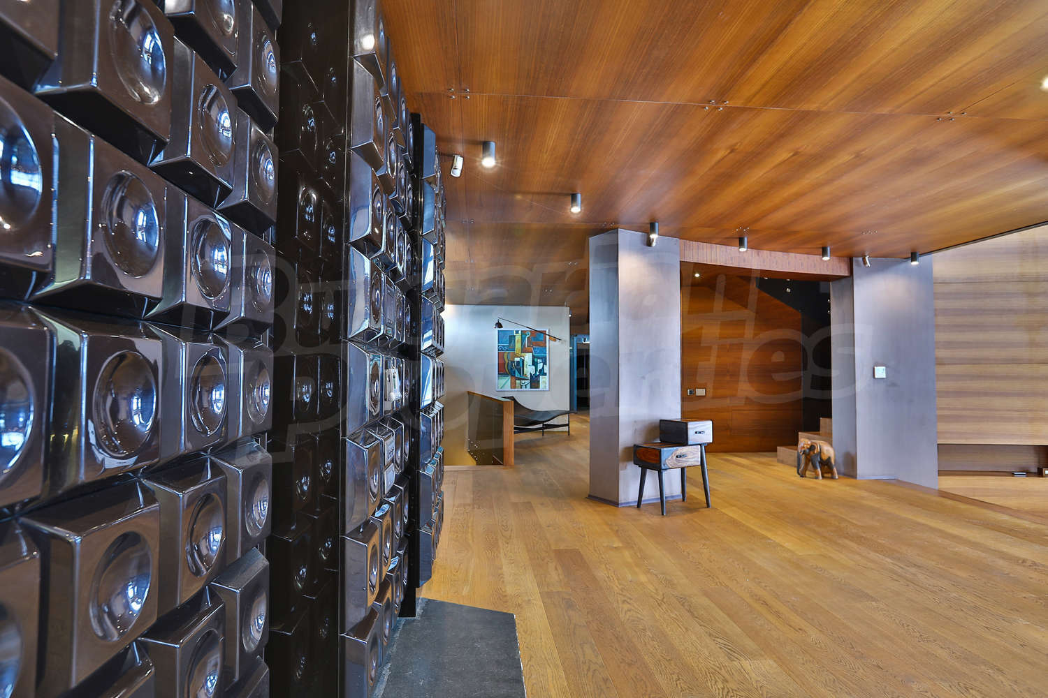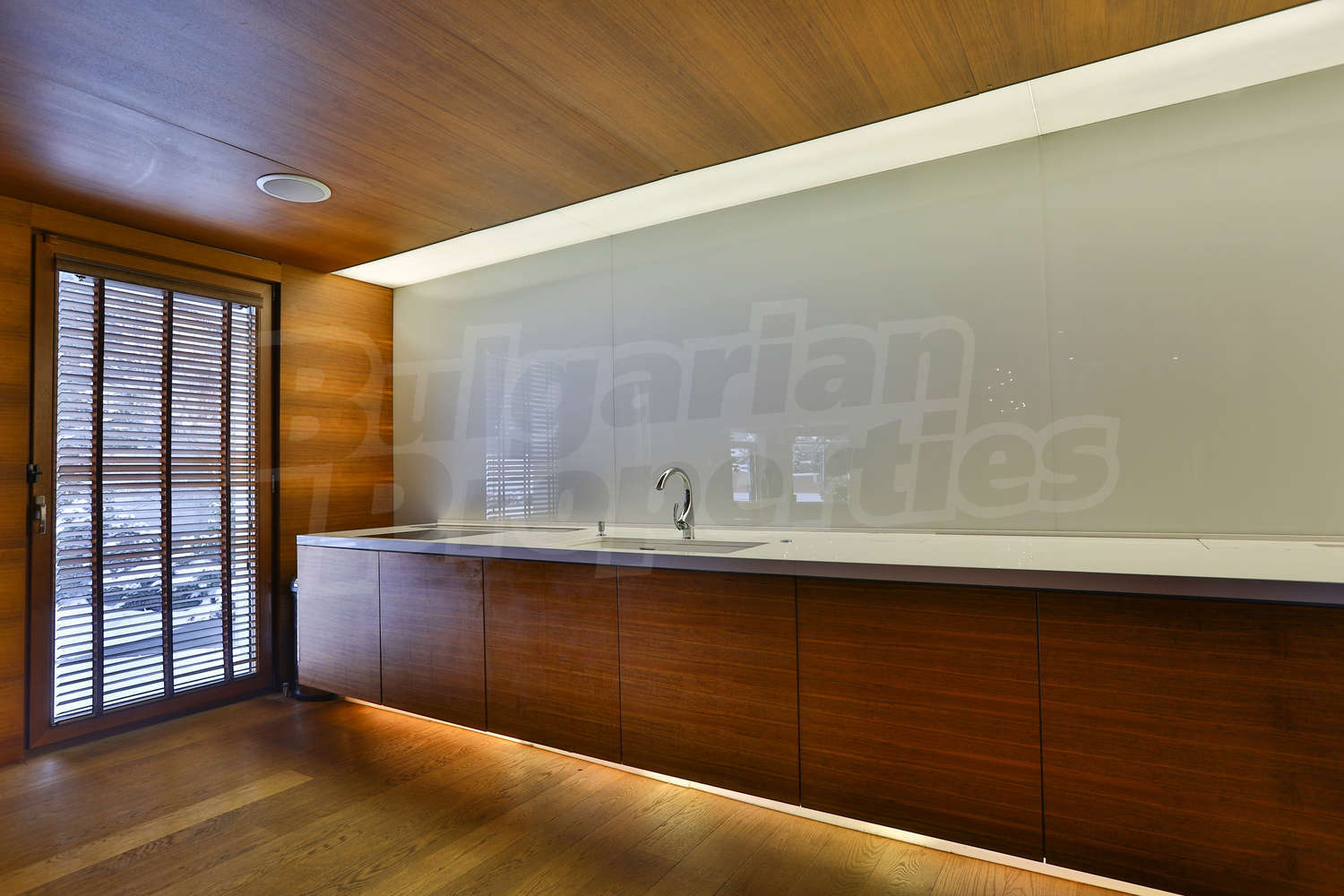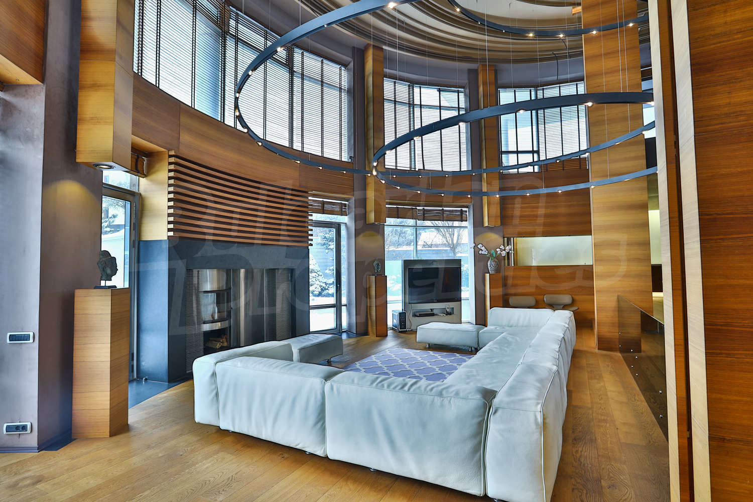Другото огромно достойнство на къщата е панорамата, може би най-добрата за къща в Бояна – и към Витоша и към София. Голяма част от пейзажа навлиза щедро в помещенията, а липсата на бариери се чувства осезателно, преминаването на една зона в друга е абсолютно безпрепятствено. Вратите и стените са сведени до минимум, а огромното пространство е омекотено и стоплено чрез обилното присъствие на дървото, което виждаме дори в тавана. Използвани са всички възможности и технологии при обработката на дървото – MDF, паркет, масив в облицовки, под и мебели, изработени по детайл.
