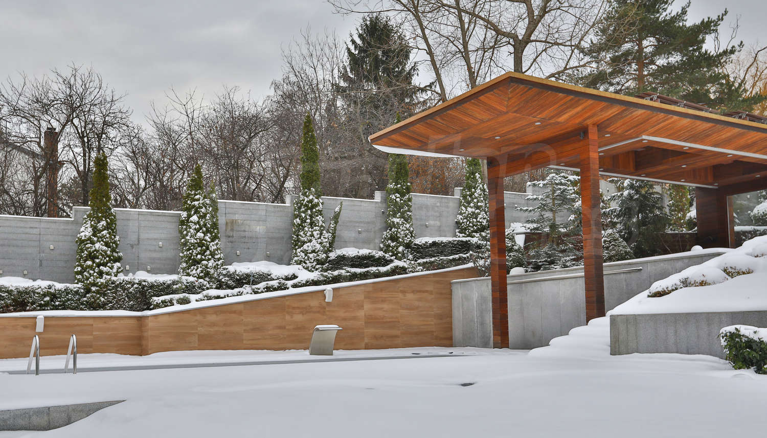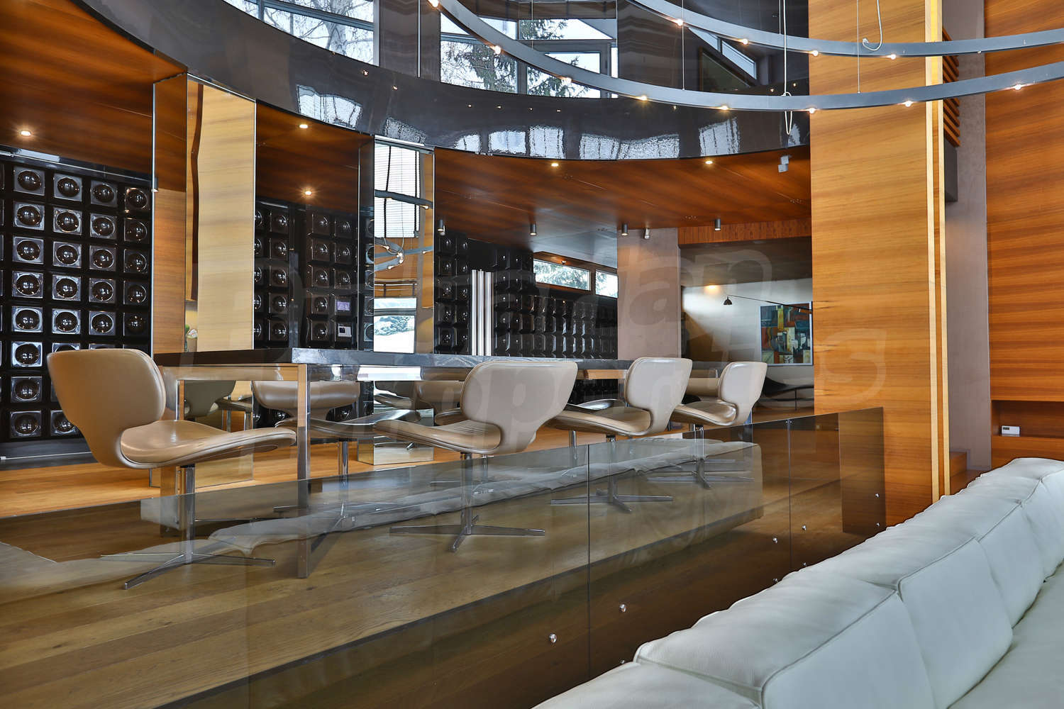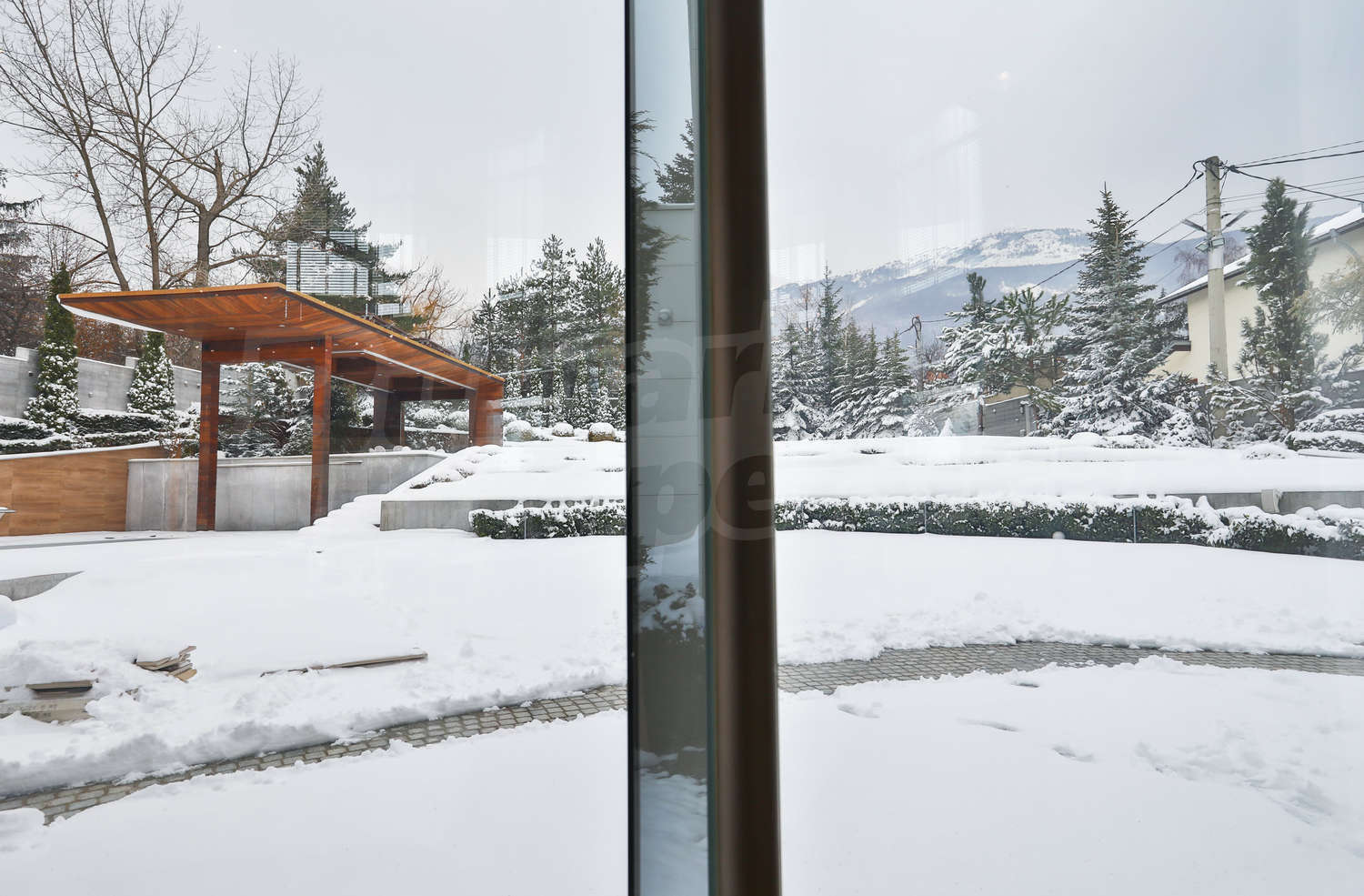 Другото огромно достойнство на къщата е панорамата, може би най-добрата за къща в Бояна – и към Витоша и към София. Голяма част от пейзажа навлиза щедро в помещенията, а липсата на бариери се чувства осезателно, преминаването на една зона в друга е абсолютно безпрепятствено. Вратите и стените са сведени до минимум, а огромното пространство е омекотено и стоплено чрез обилното присъствие на дървото, което виждаме дори в тавана. Използвани са всички възможности и технологии при обработката на дървото – MDF, паркет, масив в облицовки, под и мебели, изработени по детайл.
