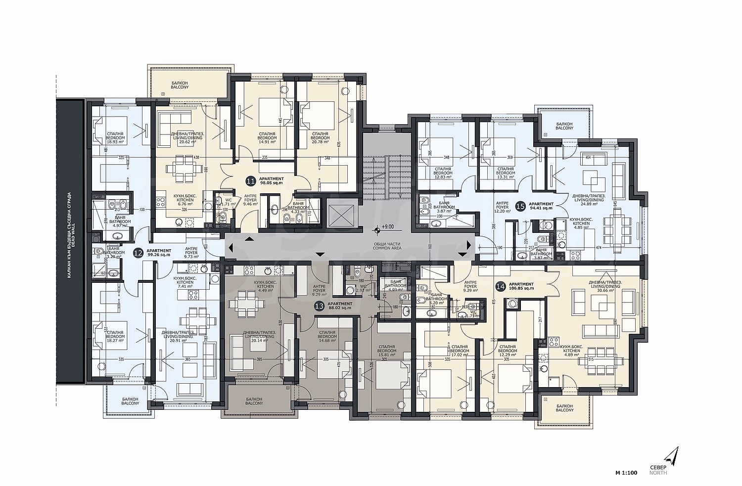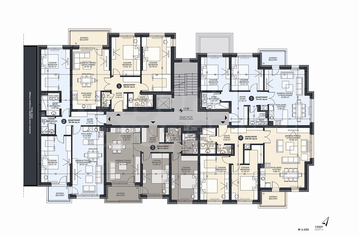 110.07 м2 (чиста площ: 94.41 м2 плюс общи части: 15.66 м2)