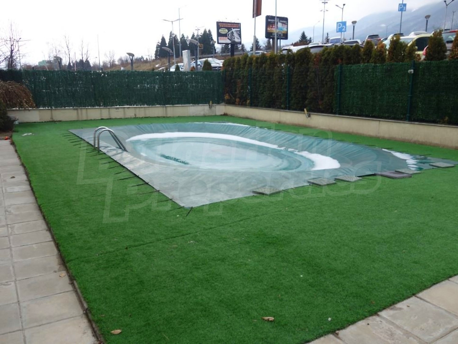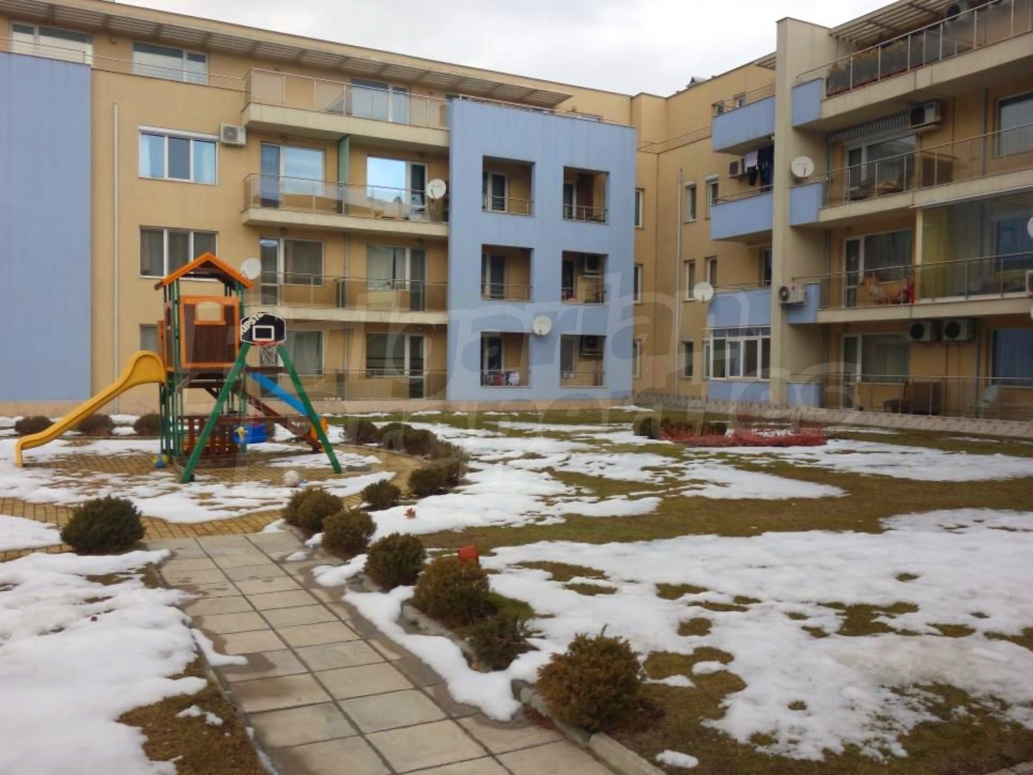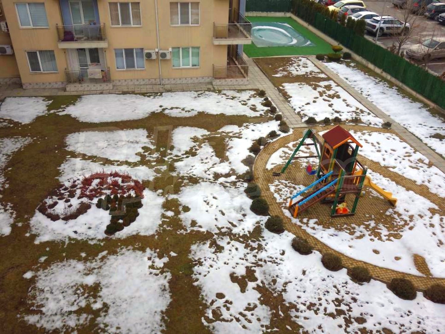 В озеленения двор има детска площадка и открит басейн.