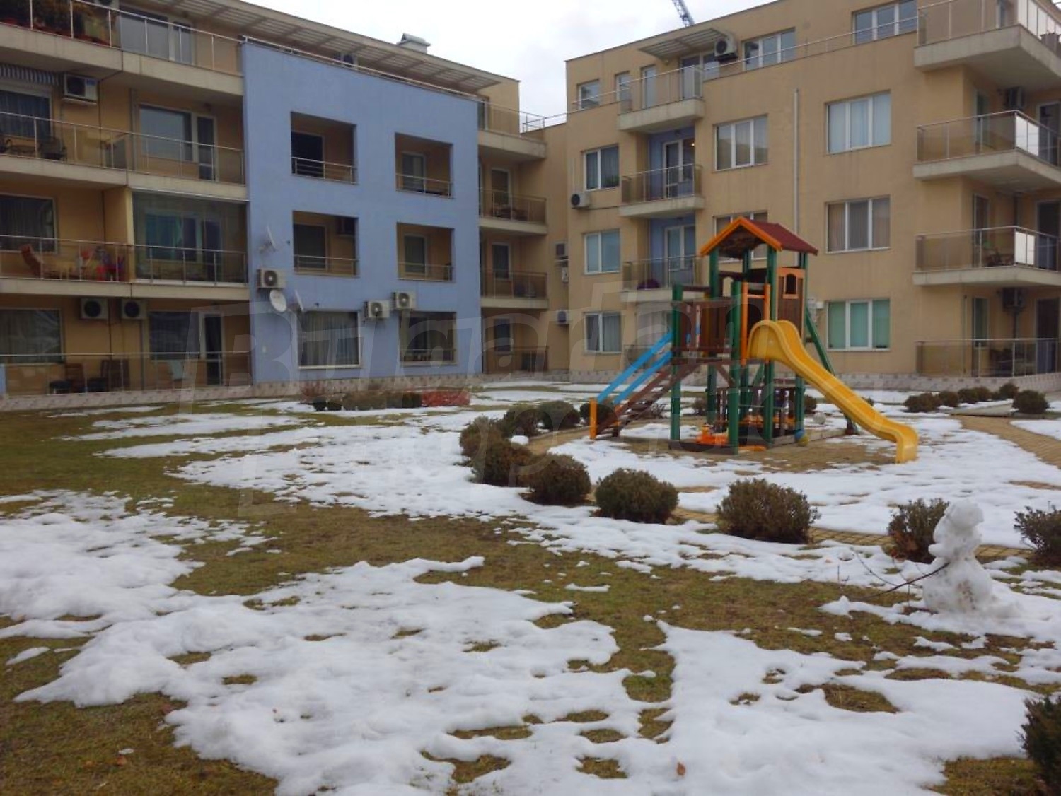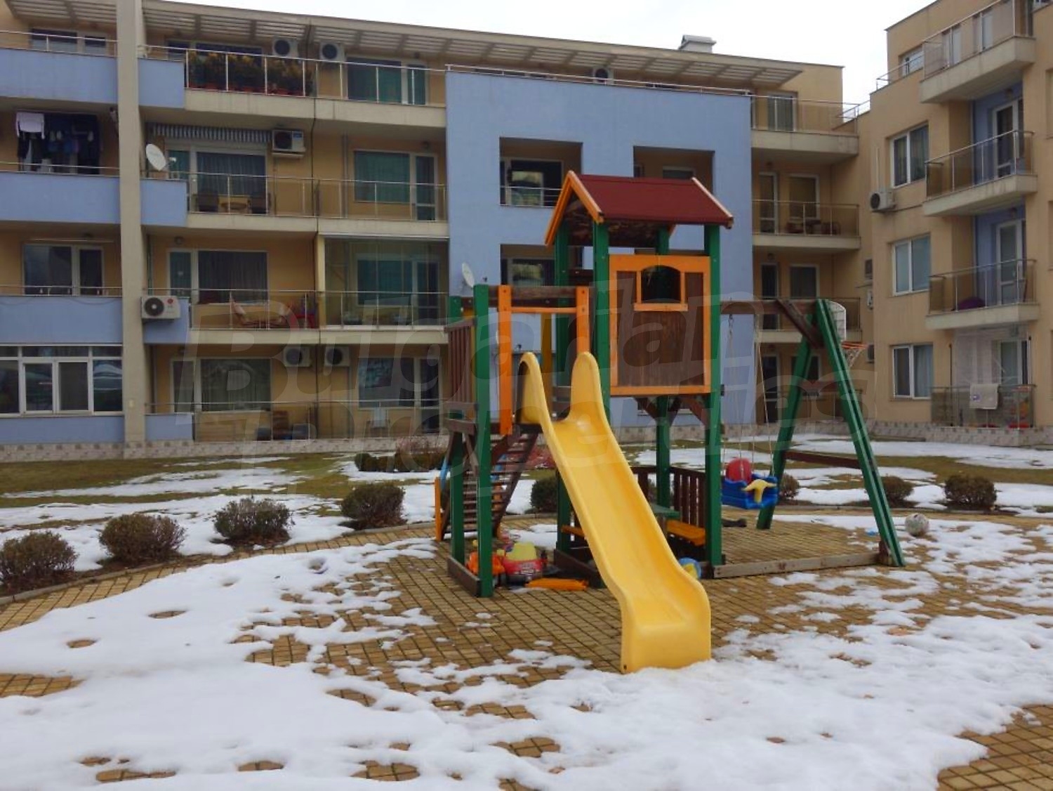 В озеленения двор има детска площадка и открит басейн.