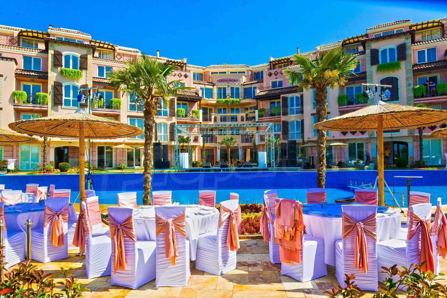 Комплексът предоставя множество услуги на територията: рецепция, паркинг, охрана и поддържка, инфинити басейн, зони за релакс и красива градина с ландшафтен дизайн. На разположение е и спа-център с басейн, сауна, джакузи и възможност за масажи.
