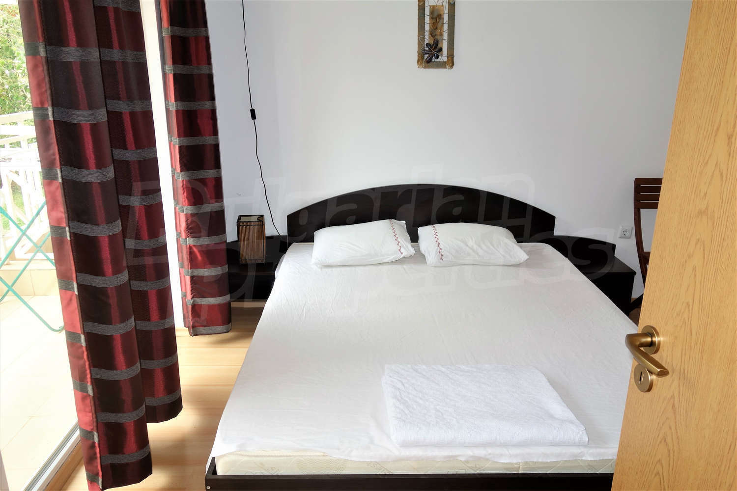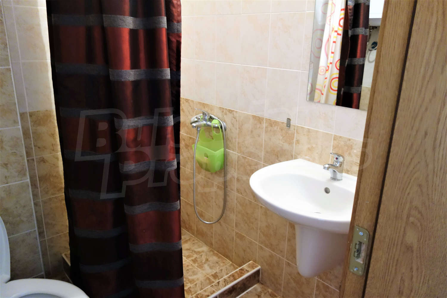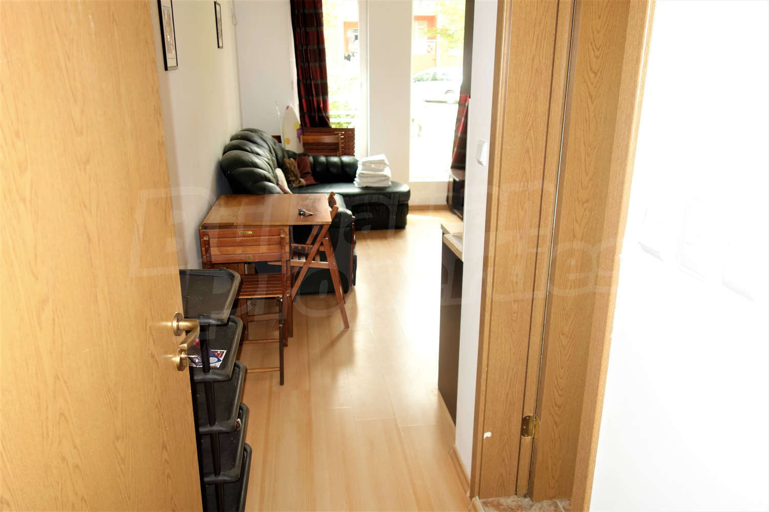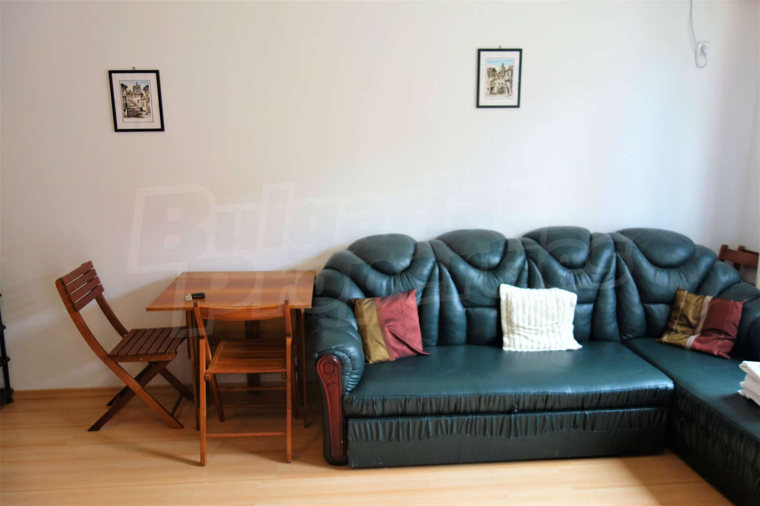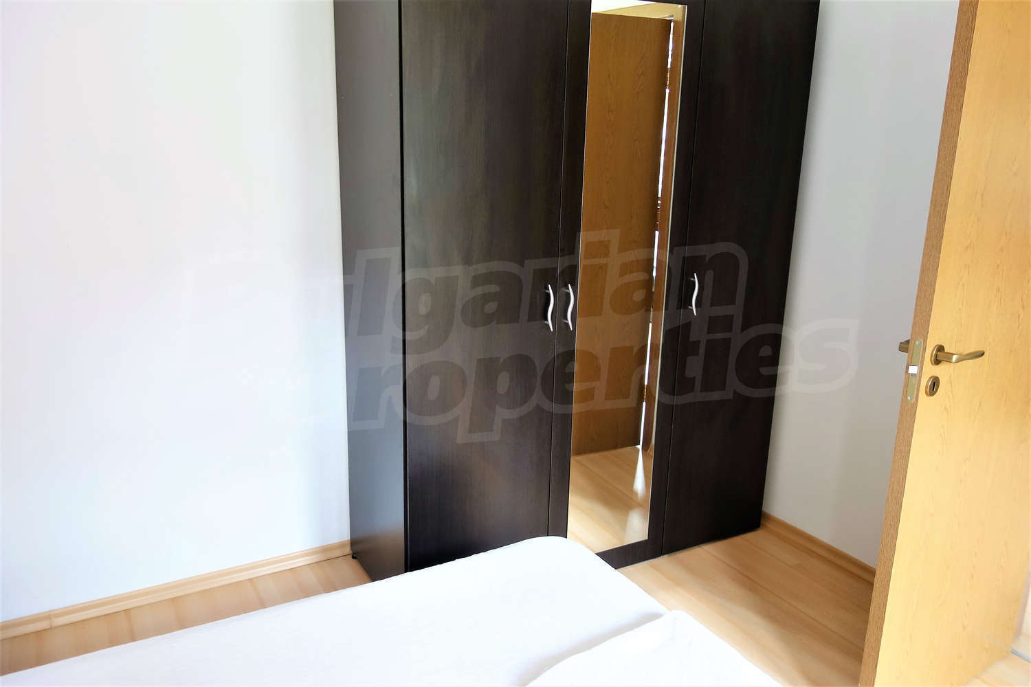 Жилището (42 кв.м.) се намира на първи етаж. Разпределя се между хол с кухненски бокс, спалня, баня с тоалетна, балкон с гледка към вътрешния двор. Предлага се за продажба с пълното обзавеждане и оборудване от снимките. Окабелен е за интернет и кабелна телевизия. Годишната такса за поддръжка на комплекса е 480 Евро на апартамент.