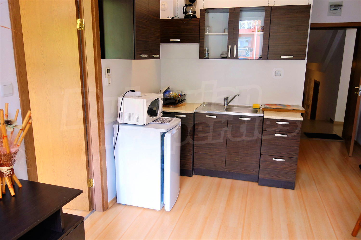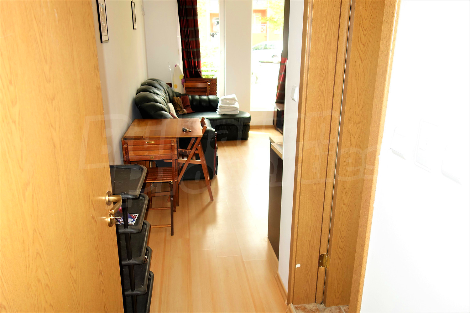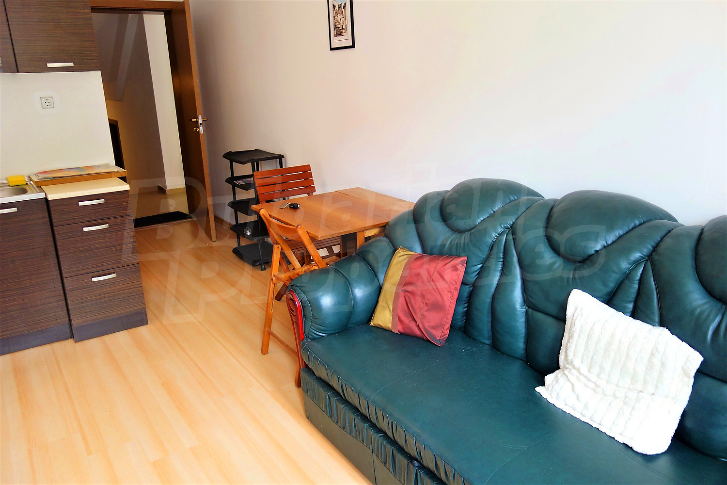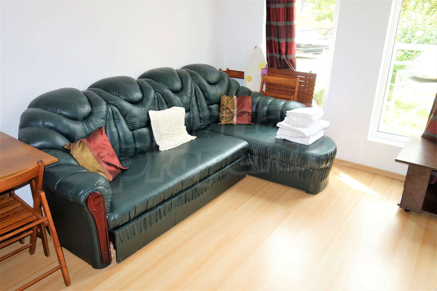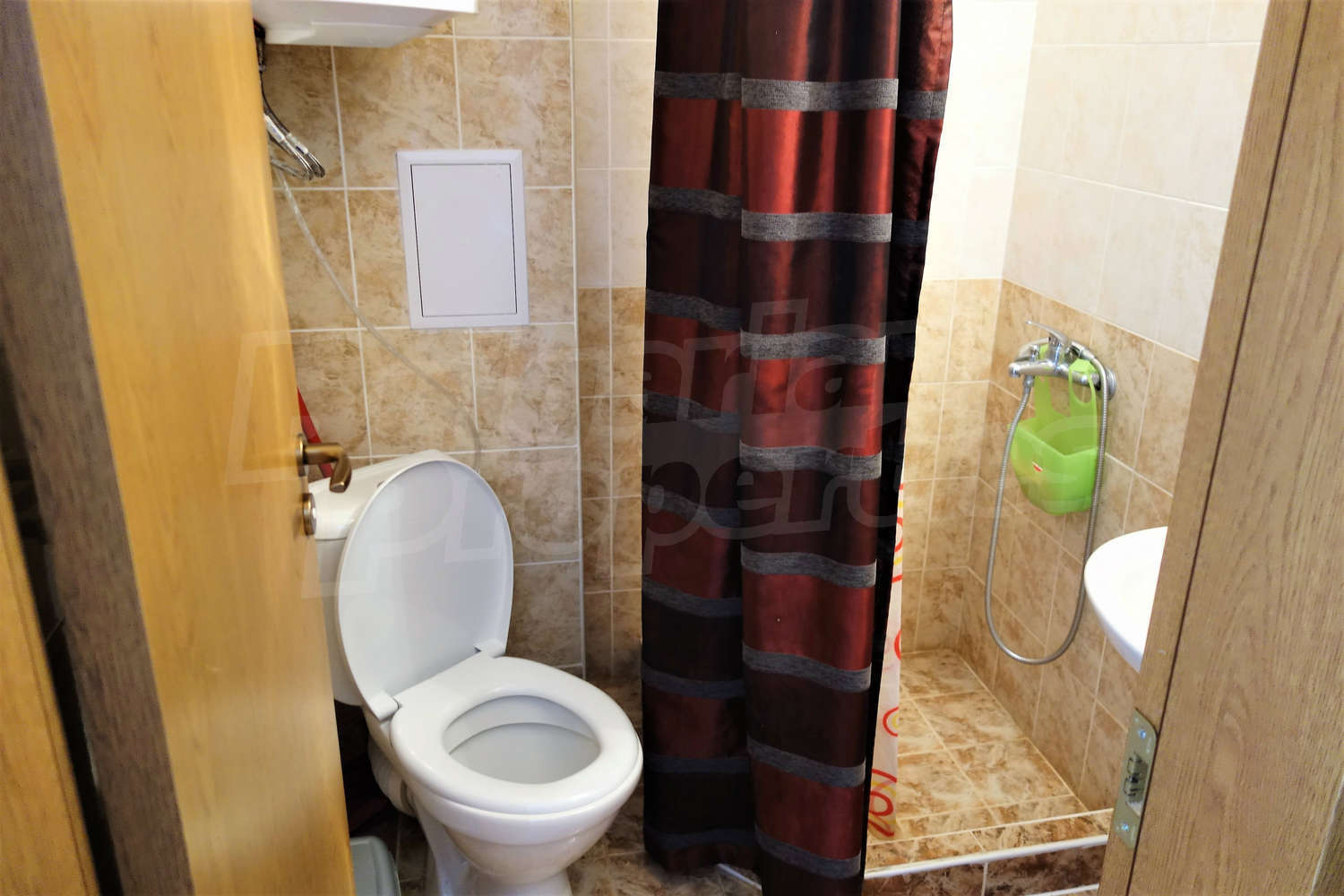 Жилището (42 кв.м.) се намира на първи етаж. Разпределя се между хол с кухненски бокс, спалня, баня с тоалетна, балкон с гледка към вътрешния двор. Предлага се за продажба с пълното обзавеждане и оборудване от снимките. Окабелен е за интернет и кабелна телевизия. Годишната такса за поддръжка на комплекса е 480 Евро на апартамент.