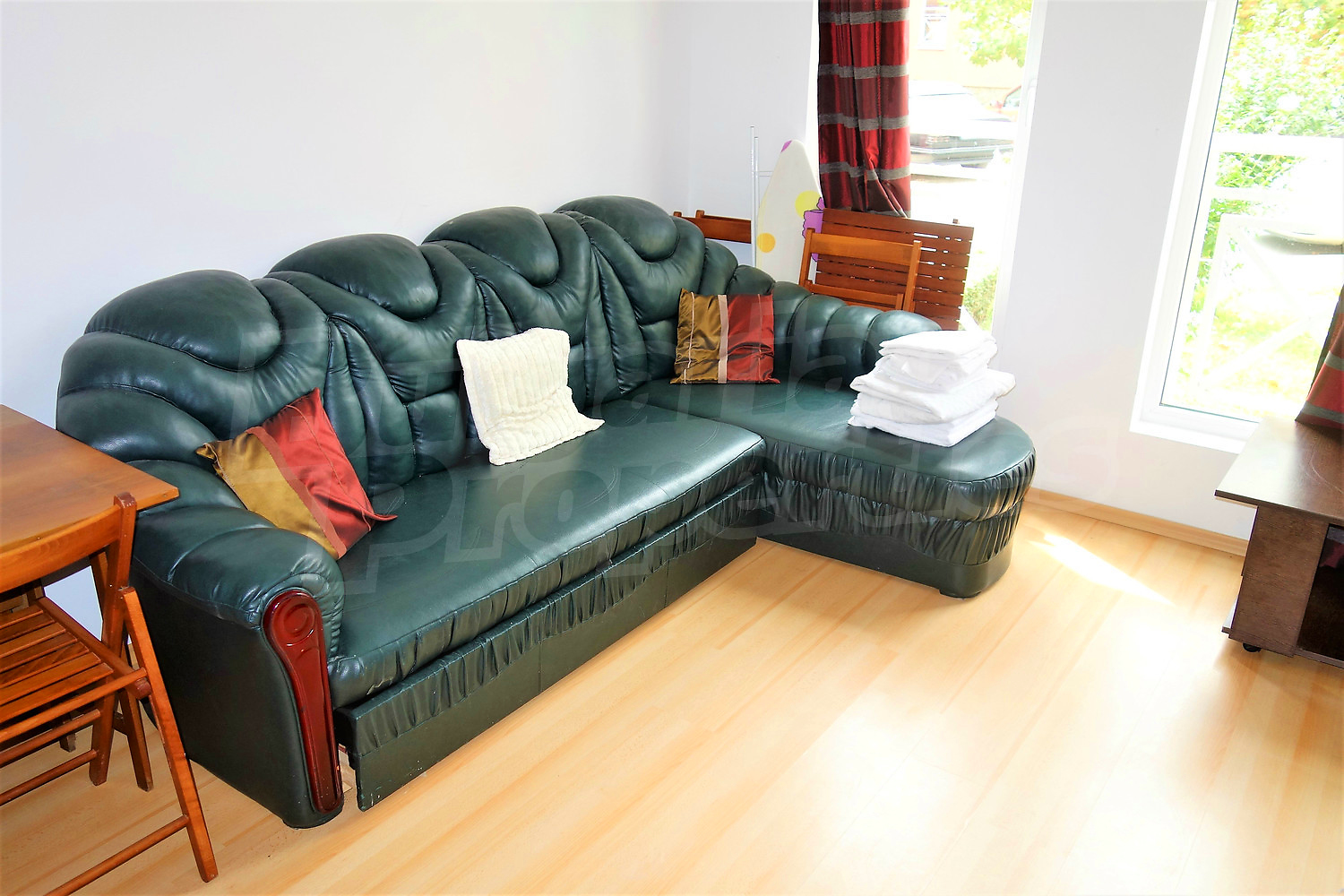 Жилището (42 кв.м.) се намира на първи етаж. Разпределя се между хол с кухненски бокс, спалня, баня с тоалетна, балкон с гледка към вътрешния двор. Предлага се за продажба с пълното обзавеждане и оборудване от снимките. Окабелен е за интернет и кабелна телевизия. Годишната такса за поддръжка на комплекса е 480 Евро на апартамент.