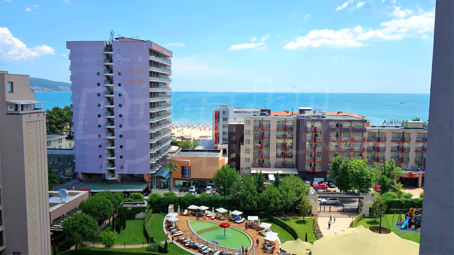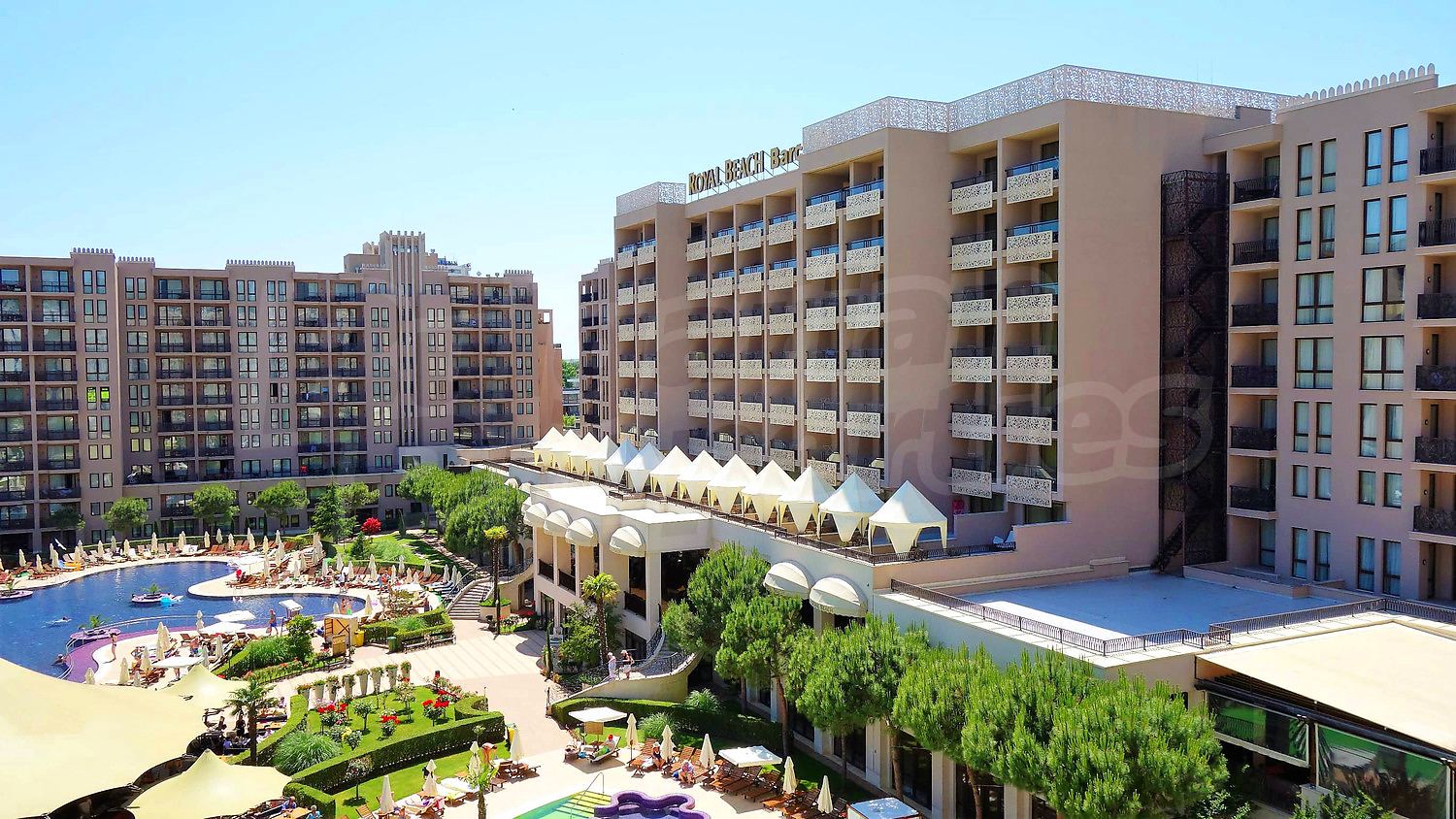 Просторният комплекс предлага огромна красива градина с външни (обща площ от над 1700 кв.м.) басейни, вътрешен отопляем басейн, 1200 кв.м. професионален СПА център, детски клуб, ресторант, търговски център с 99 магазини и охраняван подземен паркинг - модерни условия за вашите незабравими ваканции на морето.