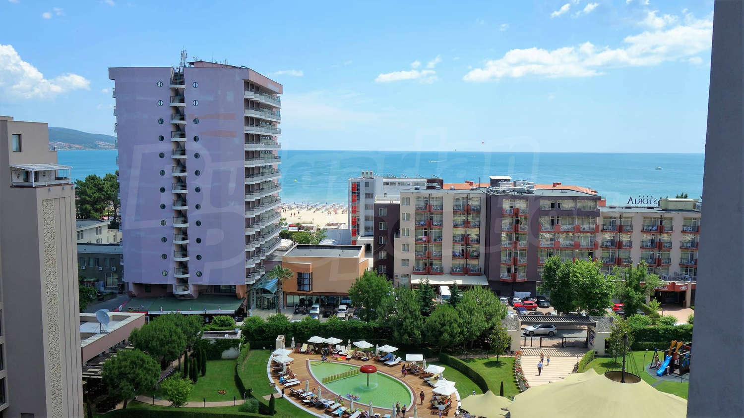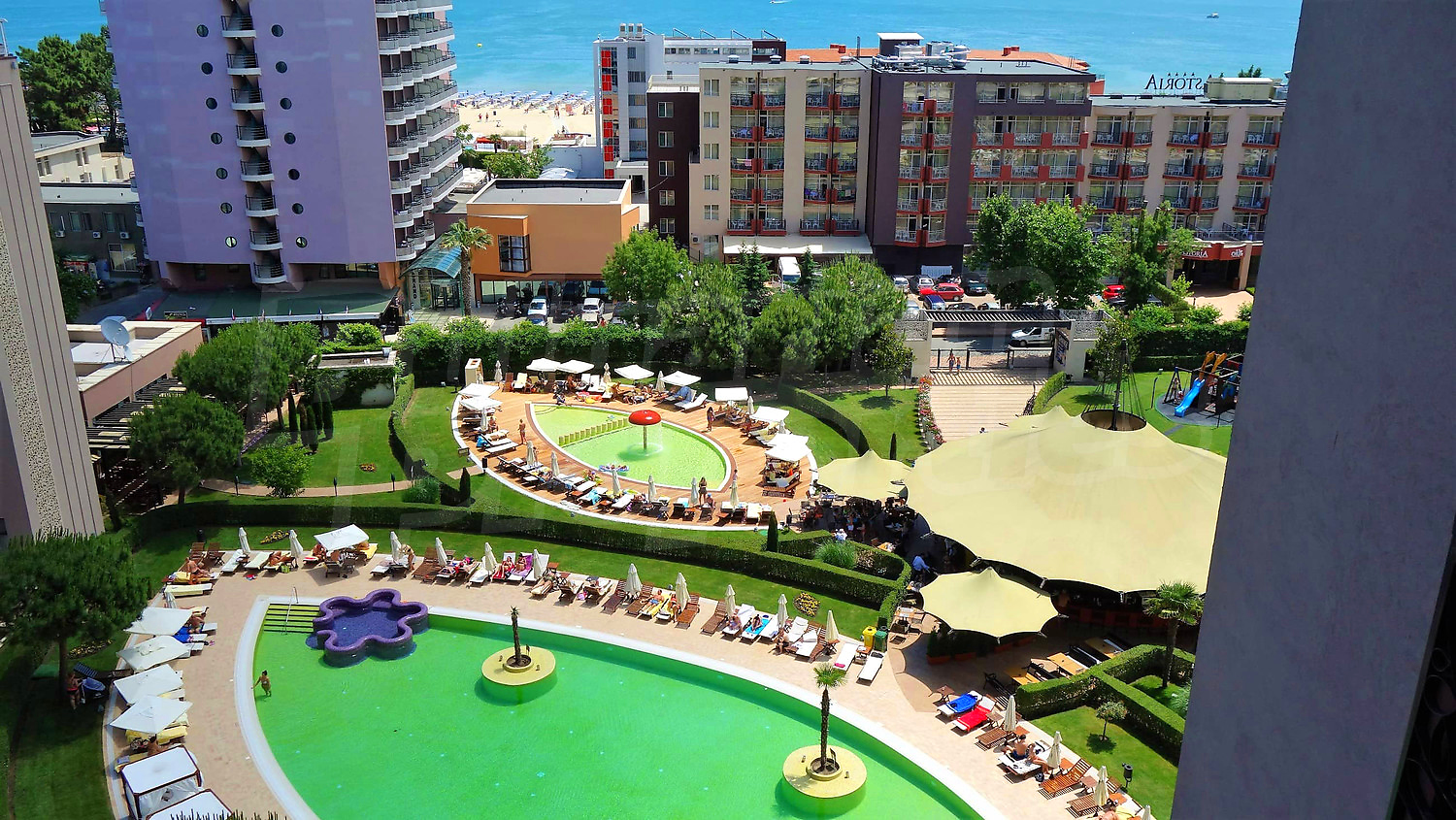 Просторният комплекс предлага огромна красива градина с външни (обща площ от над 1700 кв.м.) басейни, вътрешен отопляем басейн, 1200 кв.м. професионален СПА център, детски клуб, ресторант, търговски център с 99 магазини и охраняван подземен паркинг - модерни условия за вашите незабравими ваканции на морето.