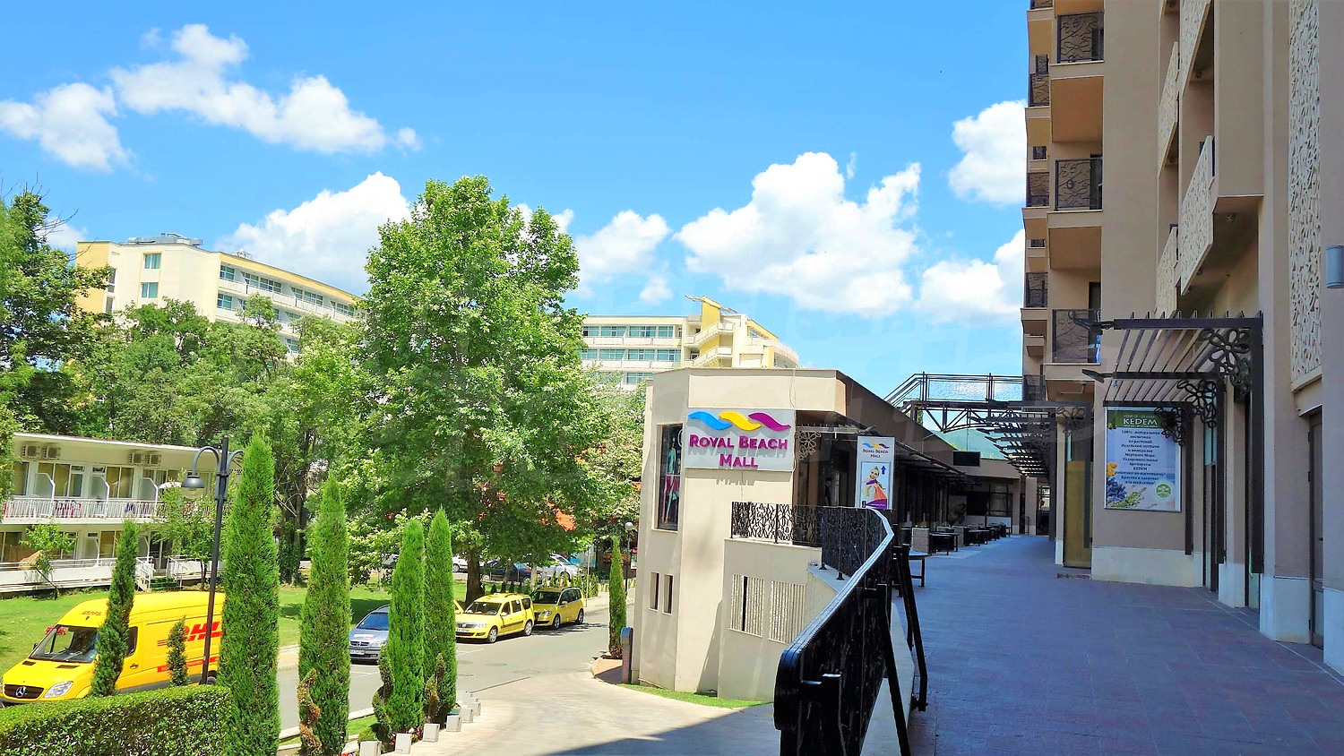 Просторният комплекс предлага огромна красива градина с външни (обща площ от над 1700 кв.м.) басейни, вътрешен отопляем басейн, 1200 кв.м. професионален СПА център, детски клуб, ресторант, търговски център с 99 магазини и охраняван подземен паркинг - модерни условия за вашите незабравими ваканции на морето.