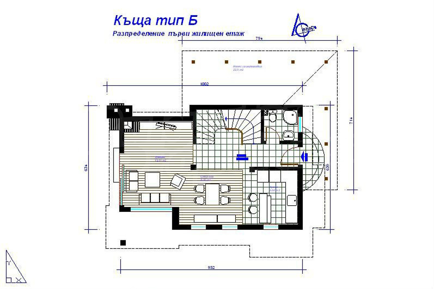 • 1-ви етаж - входно антре, хол, дневна с кухненски бокс, баня с тоалетна;