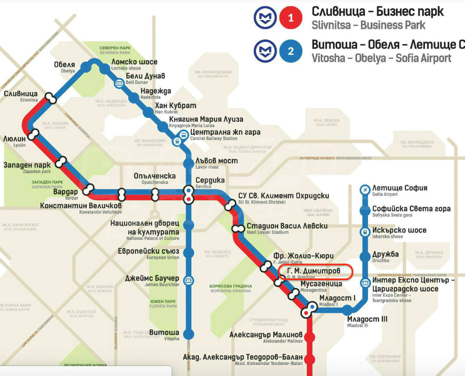 • Метростанция ГМ Димитров (на четири спирки от центъра на София и 8 спирки до летище София)