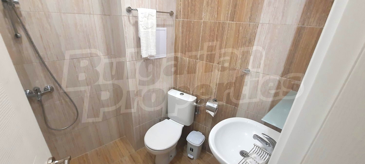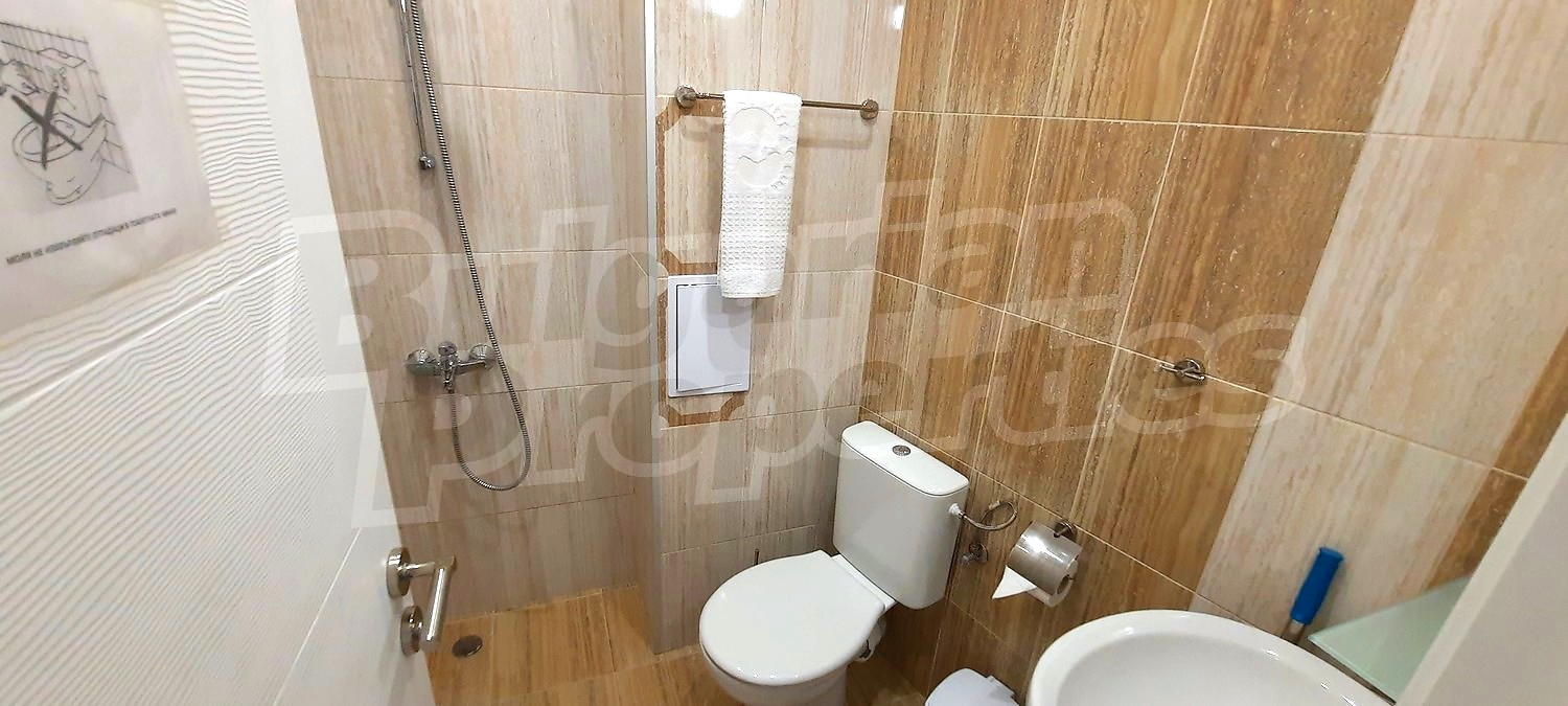 • Баня - монтирани смесители , мивка , тоалетна, душ, остъклени плочки