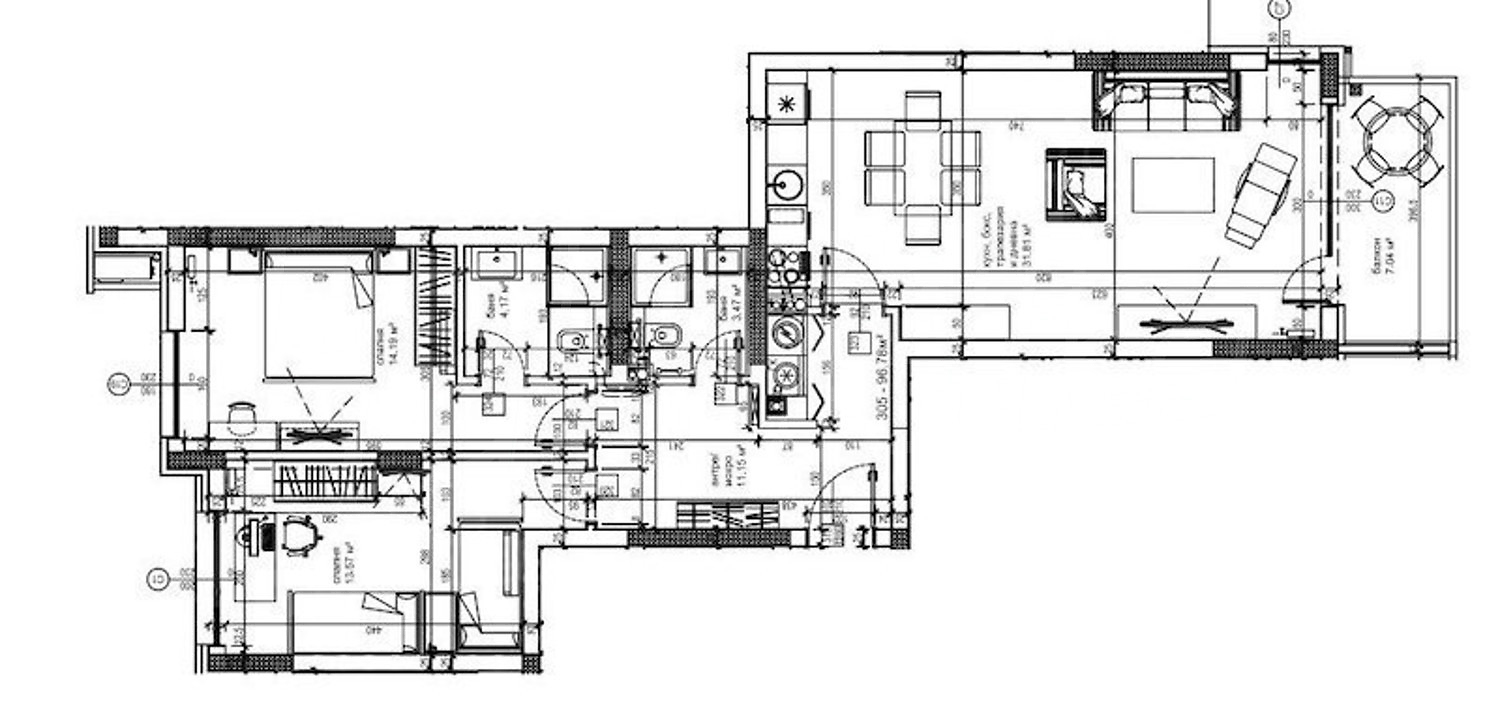 Разпределението на нетната площ от 96.78 кв.м. включва: