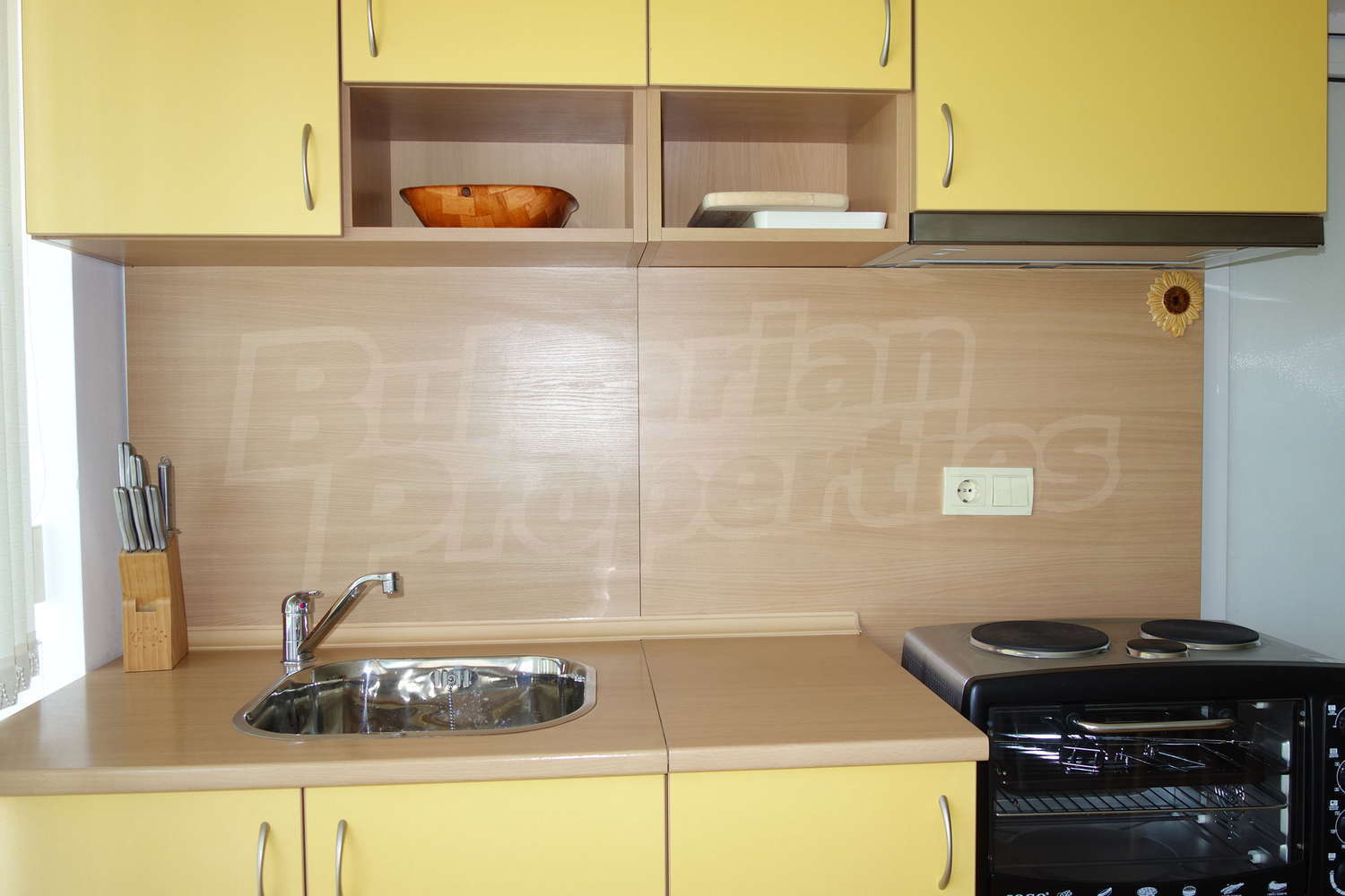 В цената е включено пълното обзавеждане. Оборудвана кухня, два разтегателни дивана, маса със столчета, гардероб, скрин. Санитарен възел с душ кабина.