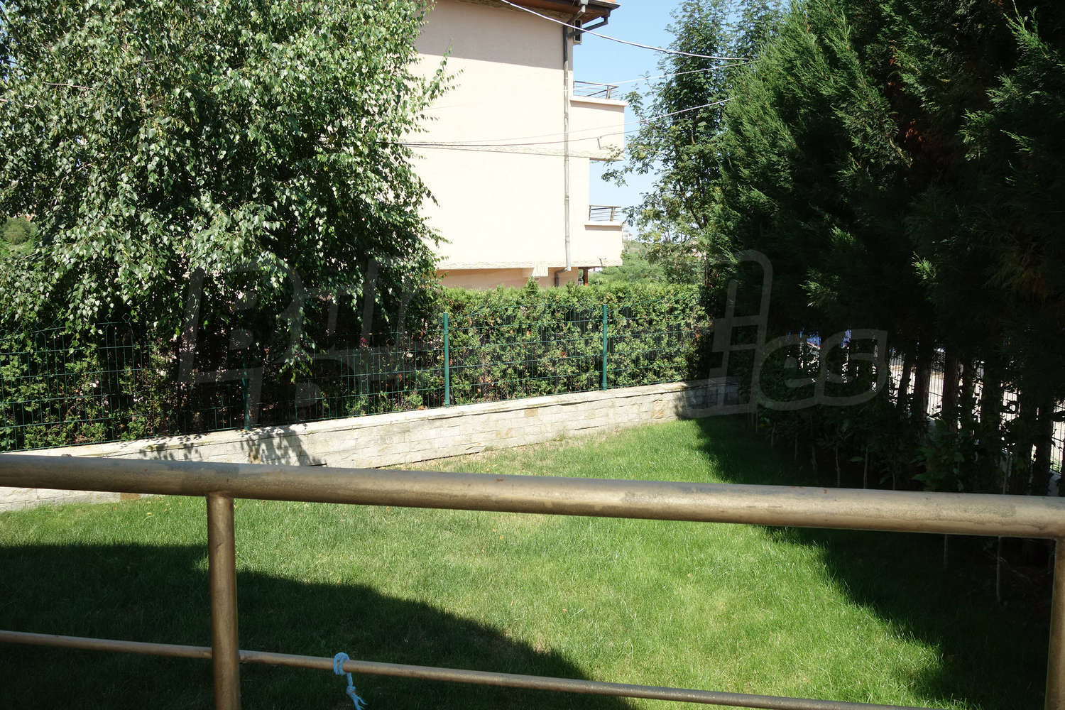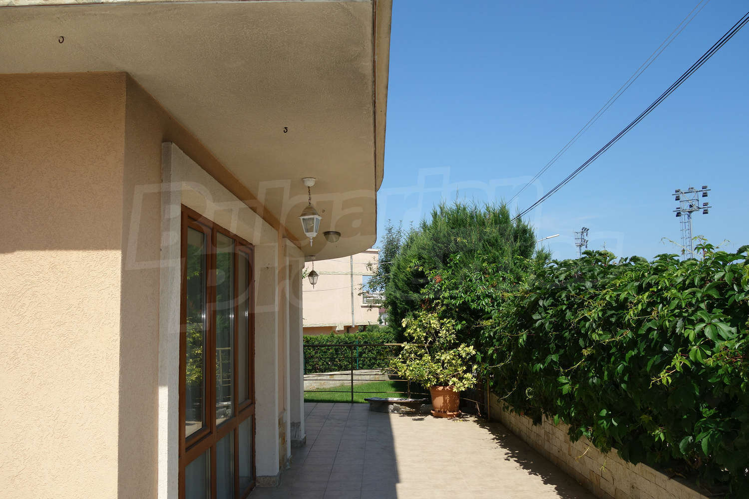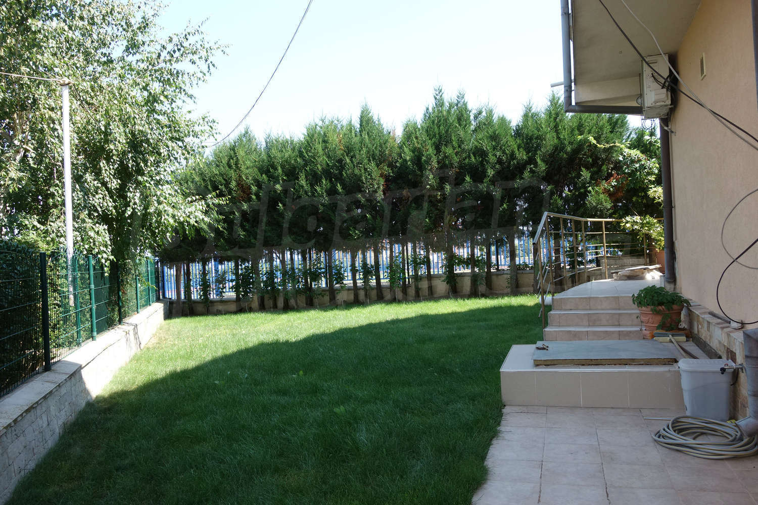 Дворът (297 кв.м.) е компактен, с паркоместа за две коли, озеленен с туи, рози, поддържани тревни площи.