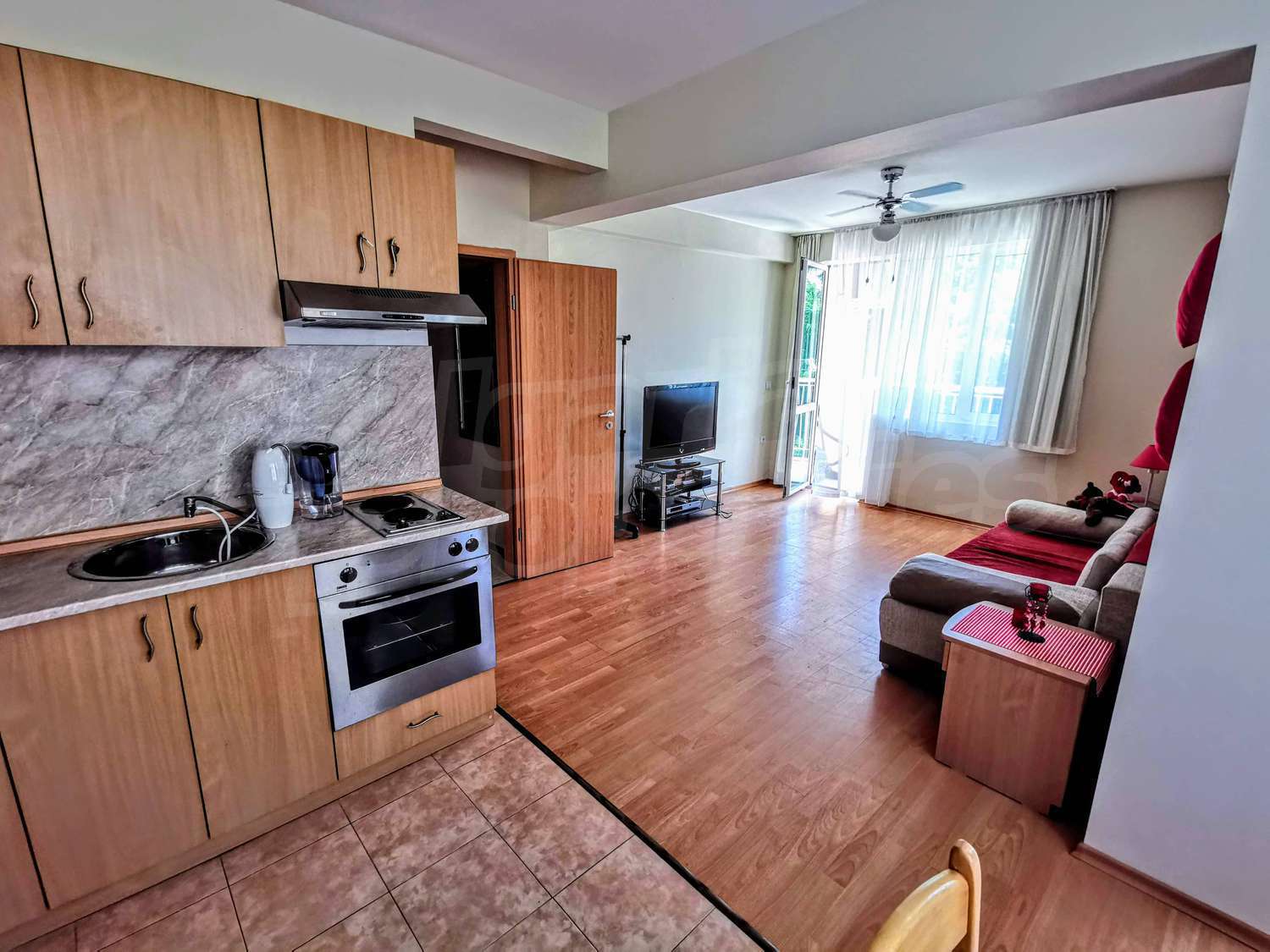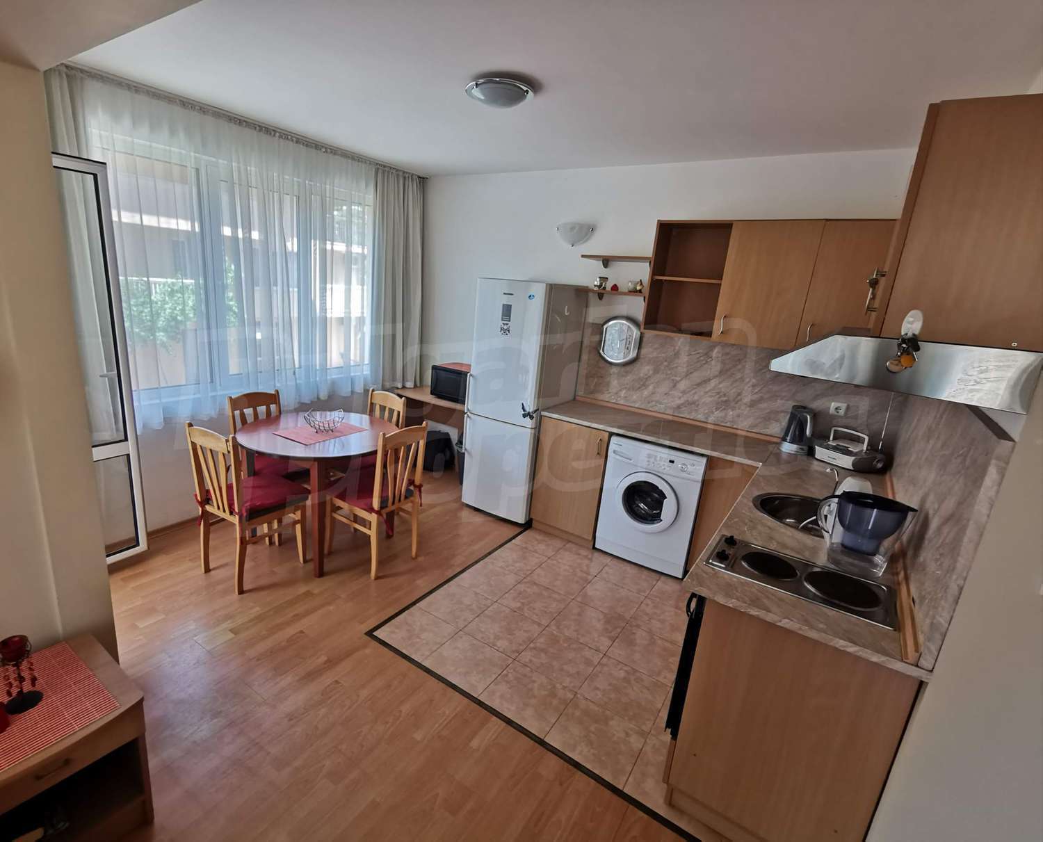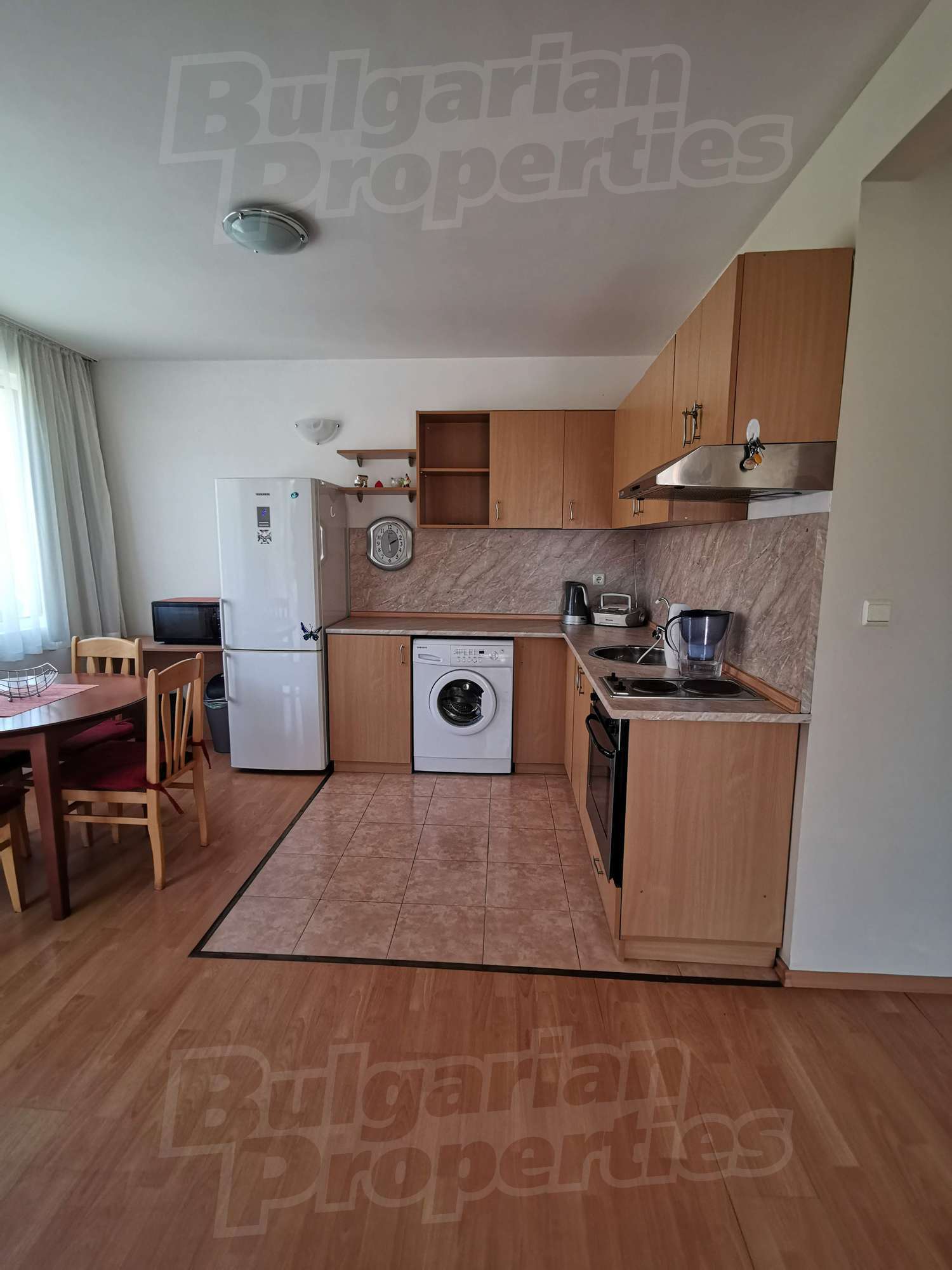 • Кухненски бокс, визуално отделен от хола, напълно обзаведен – хладилник с фризер, вградени котлони,печка, абсорбатор, пералня;