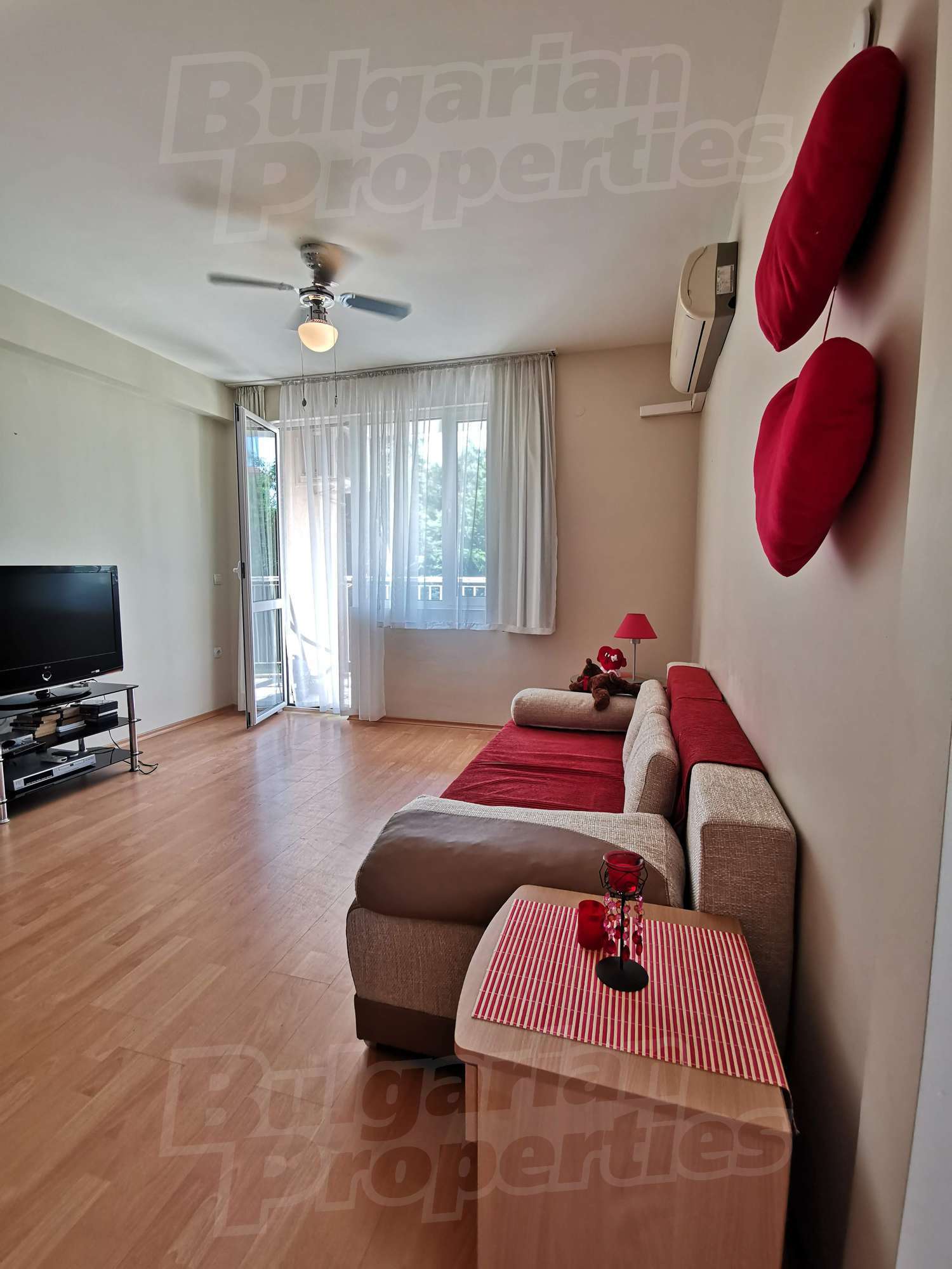 Апартаментът е с климатици, завършен с подови настилки ламинат и теракот, прозорци с PVC дограма. Годишната такса за поддръжка е 500 евро.