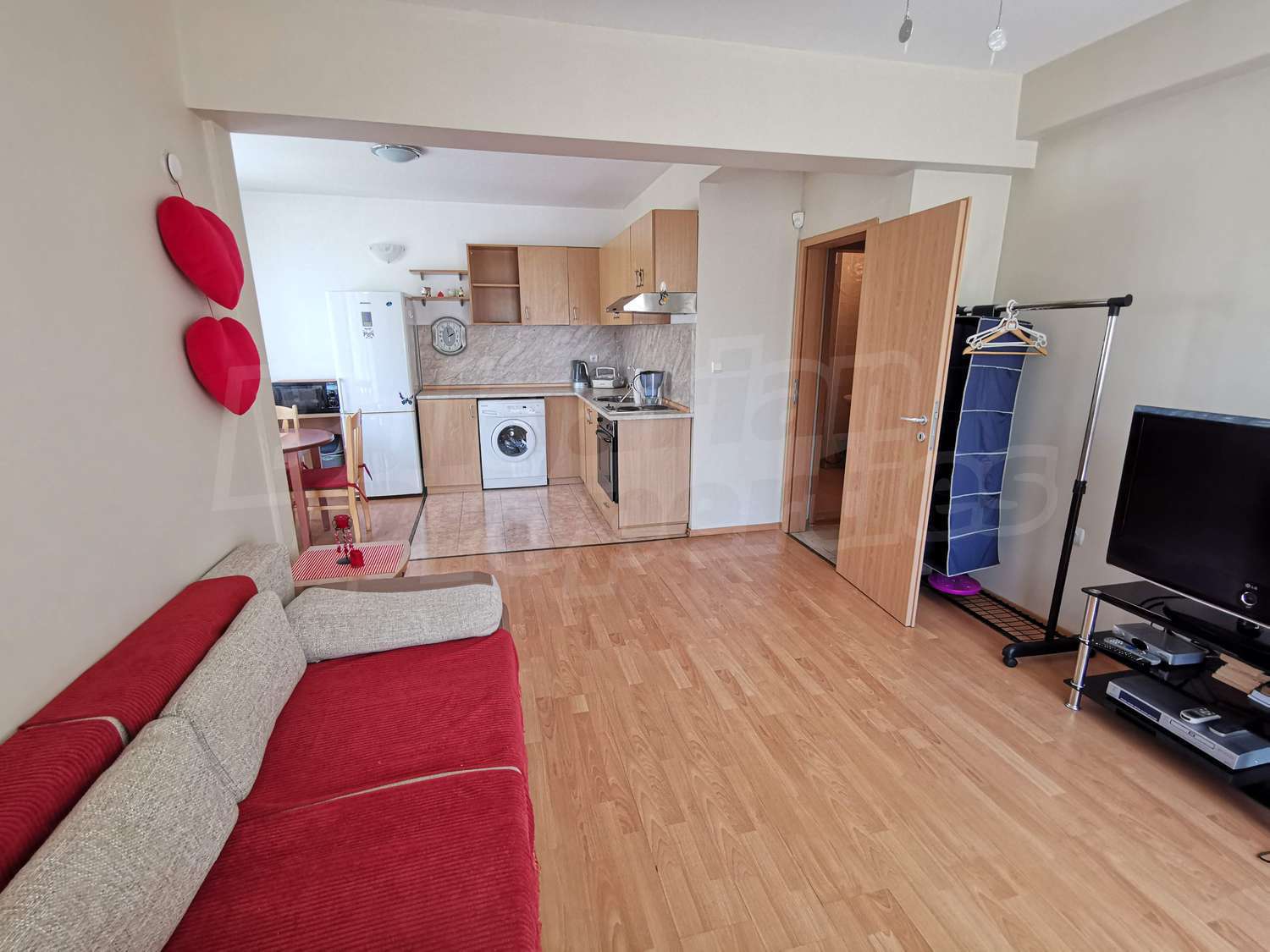 • Кухненски бокс, визуално отделен от хола, напълно обзаведен – хладилник с фризер, вградени котлони,печка, абсорбатор, пералня;