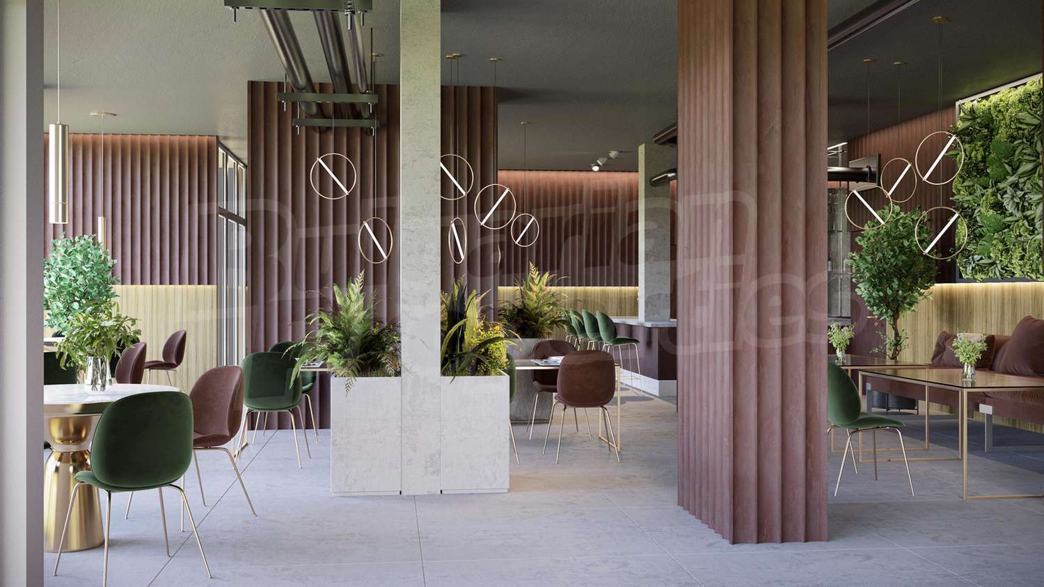 За удобство на живущите в сградата на ниво партер се разполага заведение за обществено хранене с градина, както и просторно търговско помещение и още 7 бр. по-малки търговски помещения.