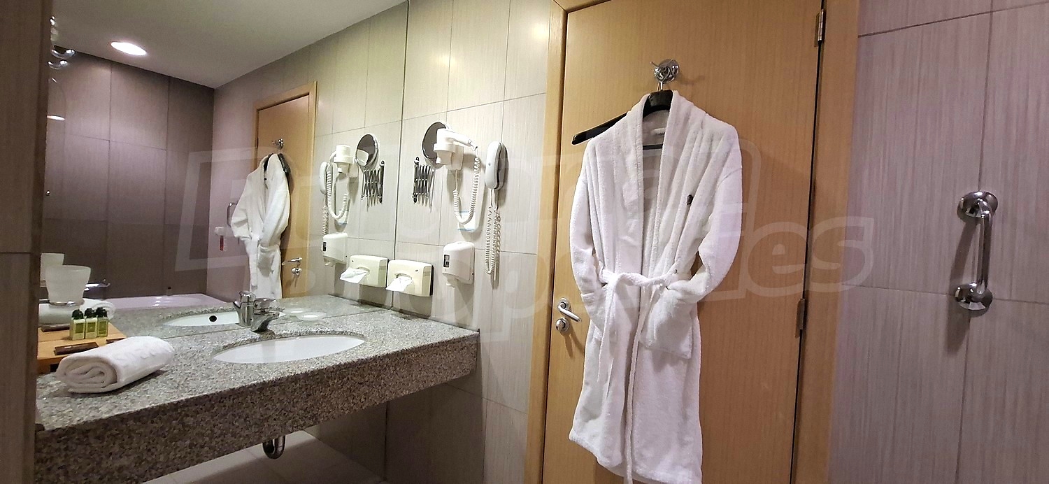 • Просторна и оборудвана баня с тоалетна - вана с душ, тоалетна, мивка с плот и огледало, телефон, SOS система, сешоар