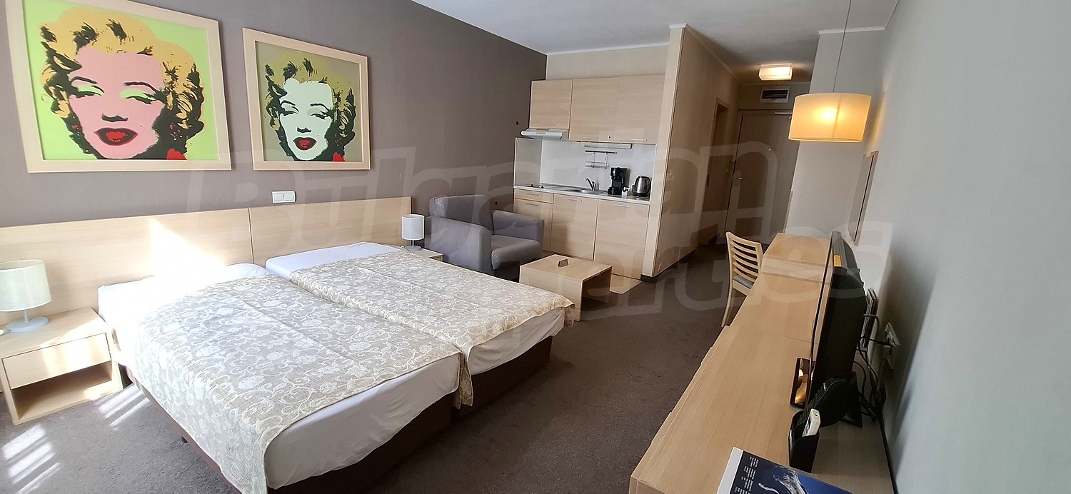 • Всекидневна със спалня - оборудвана кухня с вградени мивка, котлони, абсорбатор, хладилник, тоалетка с огледало, TV шкаф с телевизор, ниска маса, фотьойл, климатик, двойно легло с нощни шкафчета и нощни лампи