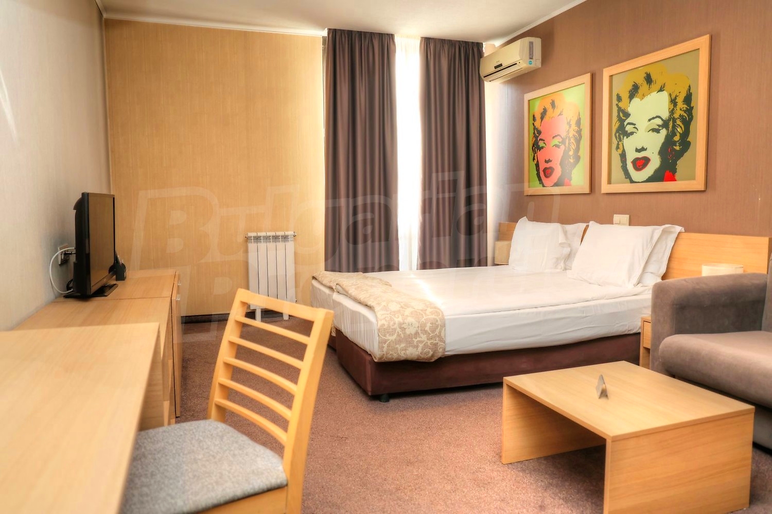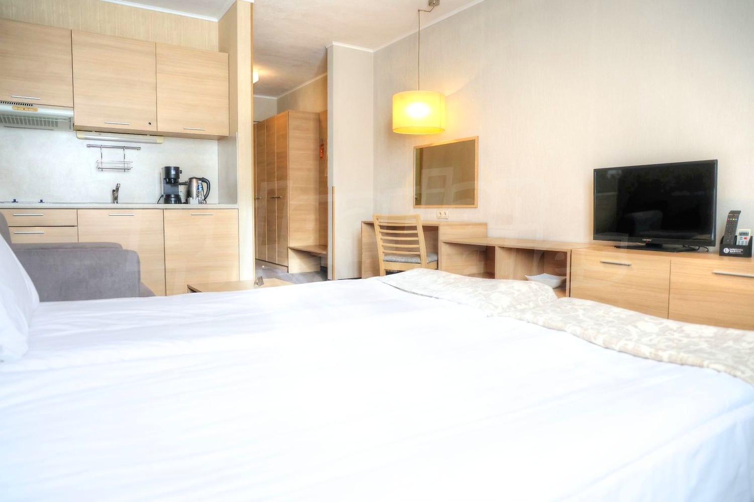 • Всекидневна със спалня - оборудвана кухня с вградени мивка, котлони, абсорбатор, хладилник, тоалетка с огледало, TV шкаф с телевизор, ниска маса, фотьойл, климатик, двойно легло с нощни шкафчета и нощни лампи