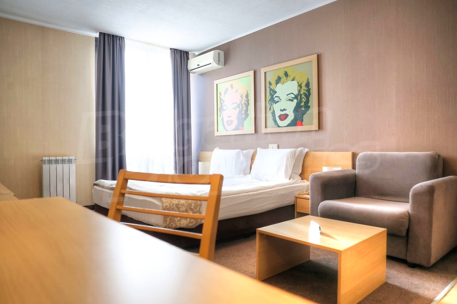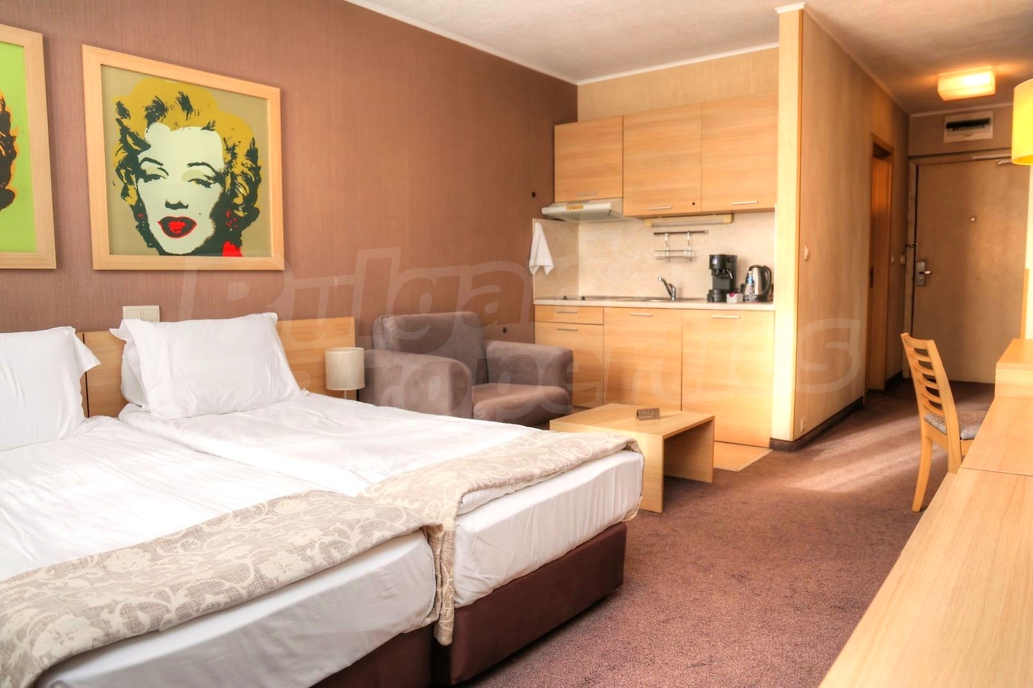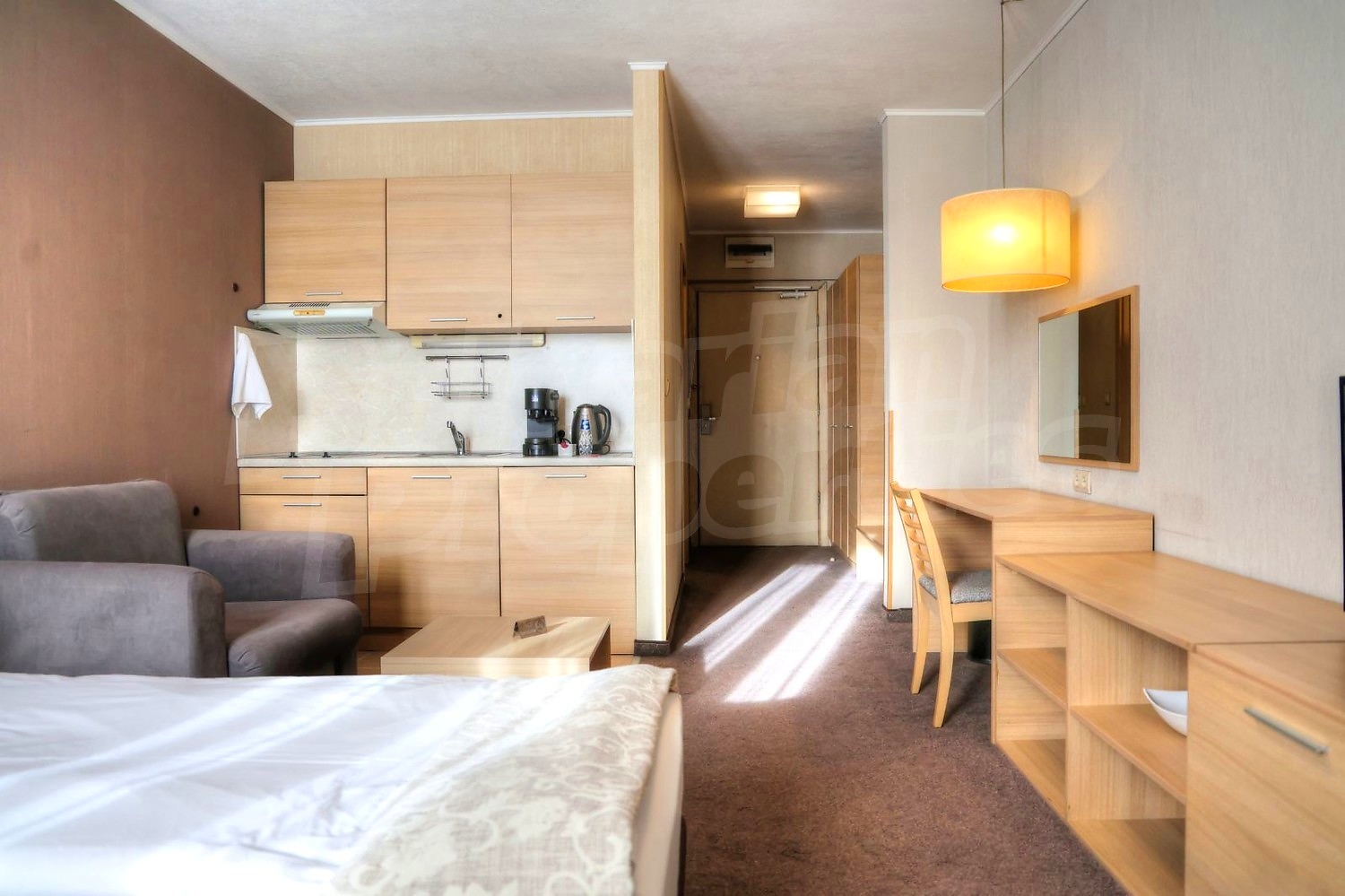 • Всекидневна със спалня - оборудвана кухня с вградени мивка, котлони, абсорбатор, хладилник, тоалетка с огледало, TV шкаф с телевизор, ниска маса, фотьойл, климатик, двойно легло с нощни шкафчета и нощни лампи