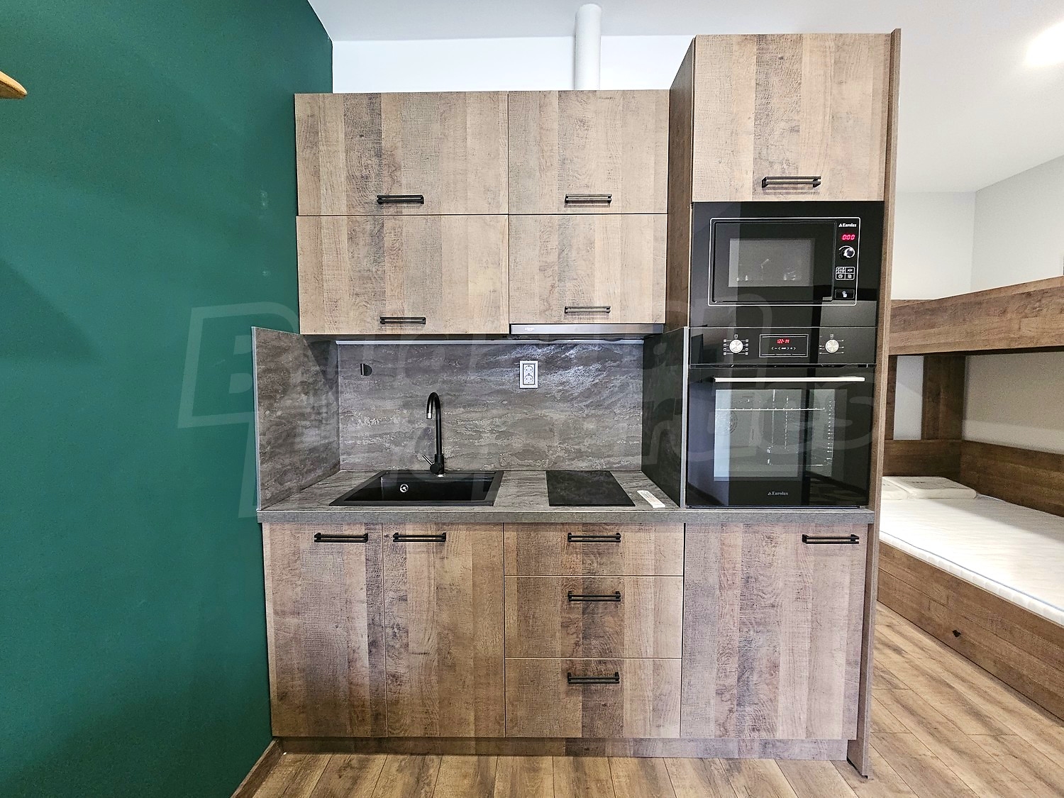 • Кухненски кът с висок клас нови вградени електроуреди - пералня със сушилня, фурна, микровълнова, котлони и аспиратор