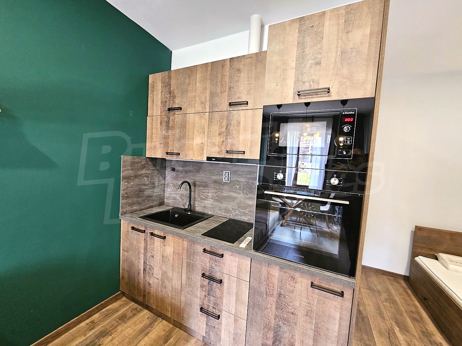 • Кухненски кът с висок клас нови вградени електроуреди - пералня със сушилня, фурна, микровълнова, котлони и аспиратор