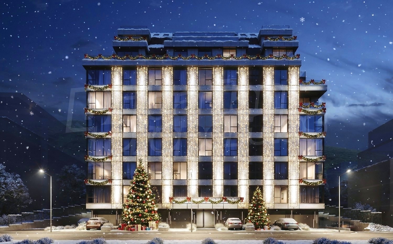 Силуетът на сградата излъчва модерност и елегантност — чисти линии, ортогонални форми и фасада, изработена от висококачествени материали като стъкло, дърво, керамични плочи и мазилка. Избраните натурални цветове и вертикални елементи придават усещане за топлота и лекота.