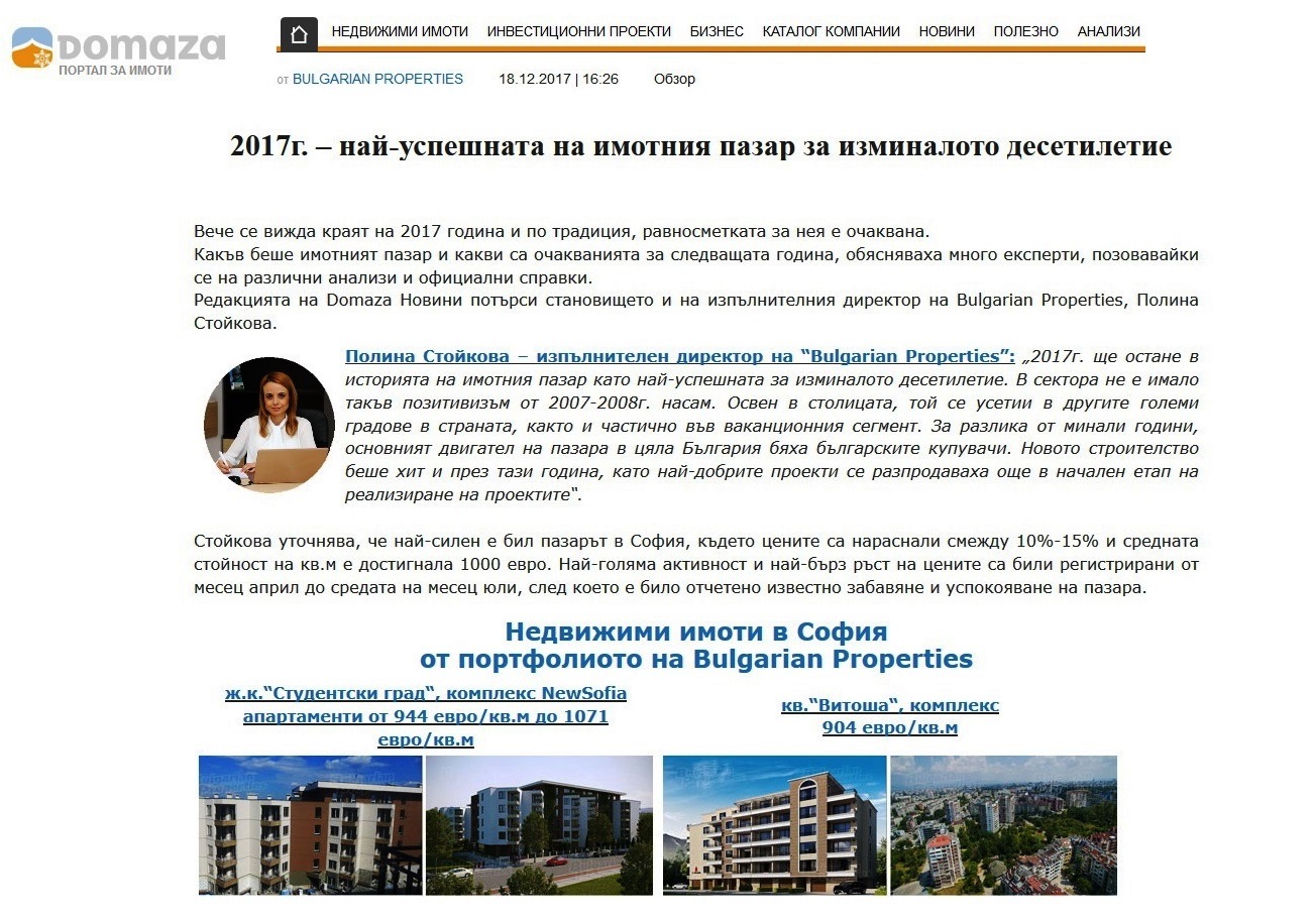 „2017г. ще остане в историята на имотния пазар като най-успешната за изминалото десетилетие. В сектора не е имало такъв позитивизъм от 2007-2008г. насам. Освен в столицата, той се усетии в другите големи градове в страната, както и частично във ваканционния сегмент. За разлика от минали години, основният двигател на пазара в цяла България бяха българските купувачи. Новото строителство беше хит и през тази година, като най-добрите проекти се разпродаваха още в начален етап на реализиране на проектите“.