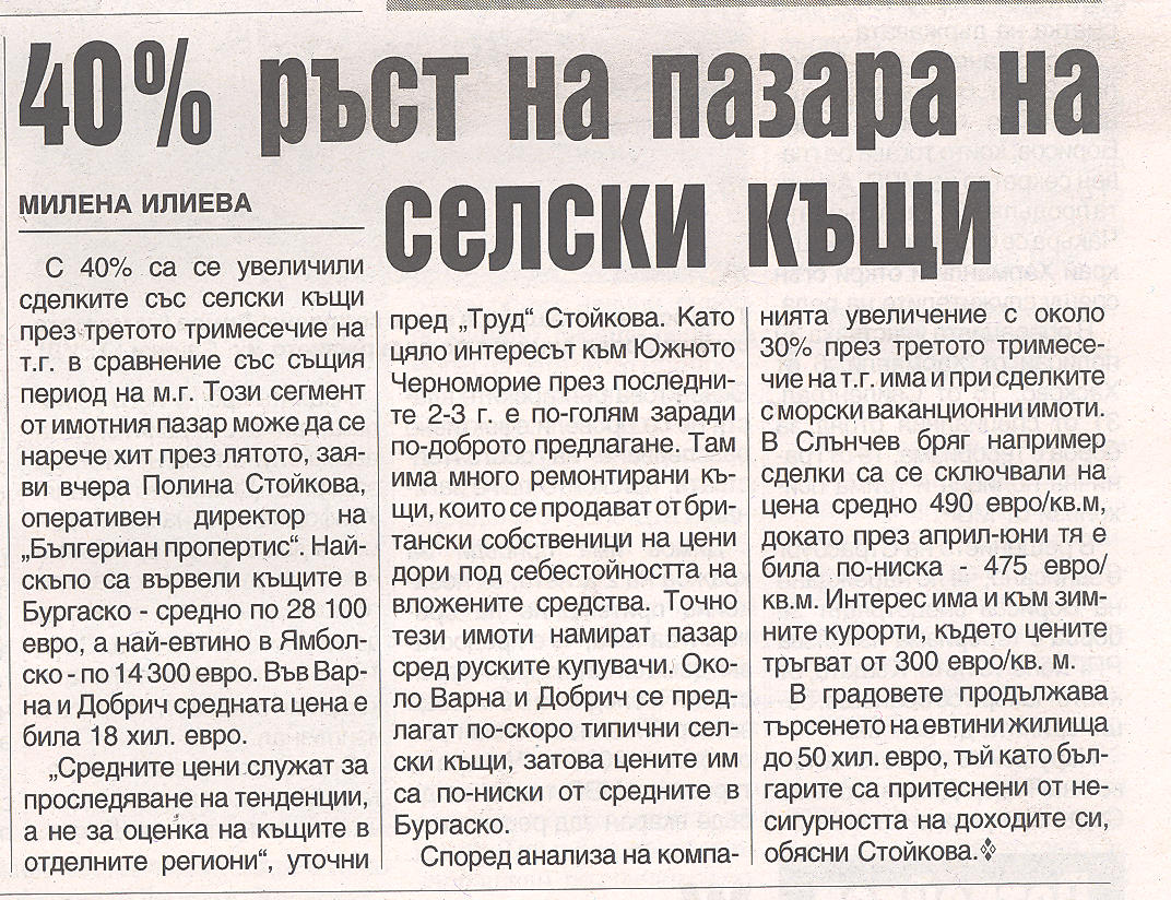 С 40% са се увеличили сделките със селски къщи през третото тримесечие на т.г. в сравнение със същия период на м.г. Този сегмент от имотния пазар може да се нарече хит през лятото, заяви вчера Полина Стойкова, оперативен директор на BULGARIAN PROPERTIES. Най-скъпо са вървели къщите в Бургаско - средно по 28 100 евро, а най-евтино в Ямболско - по 14 300 евро. Във Варна и Добрич средната цена е била 18 хил. евро.
