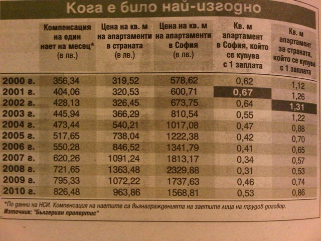 Анализът на Бългериан Пропертис по данни на НСИ за цените на апартаментите в София след приспадане на инфлацията показват следното: през 2010 г. хората с месечното си възнаграждение са можели да си купят около 0,5 кв. м, а пет години по-рано - 0,4 кв. м. Причината е, че цените спаднаха, а компенсациите на наетите продължават да нарастват, коментират от агенцията.