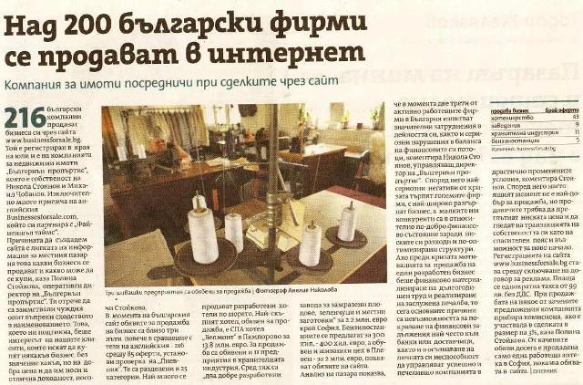 216 български компании продават бизнеса си чрез сайта www.businessforsale.bg. Той е регистриран в края на юли и е на компанията за недвижими имоти "Бългериън пропъртис", която е собственост на Никола Стоянов и Михаил Чобанов. Изключително много прилича на английския Businessesforsale.com, който си партнира с "Файненшъл таймс".