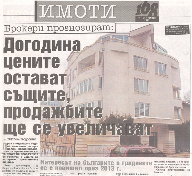 "Изминалото тримесечие се характеризира с голяма динамика както в летните курорти, така и в големите градове, съобщават от BULGARIAN PROPERTIES. Двата основни дяла на пазара - градските и ваканционните имоти, се различават и по количество продажби, и по профила на купувачите, които проявяват интерес. В градовете основният дял от интересуващите се са българи, докато във ваканционните курорти - руснаци. „През третото тримесечие на 2013 г. се забелязва увеличение на продажбите в сравнение със същия период от миналата година, която беше сравнително слаба", уточнява Полина Стойкова. Затова не може да се направи генерален извод за вдигане на цените.