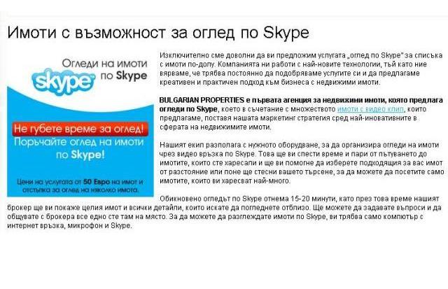 Огледи по Skype предлага фирмата за недвижими имоти Bulgarian Properties. Услугата включва разглеждането на много обекти с видеоклип. Тази иновативна маркетинг стратегия се използва за първи път у нас в сферата на недвижимите имоти.