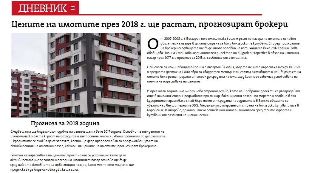 От 2007-2008 г. в България не е имало такъв голям ръст на пазара на имоти, а основен двигател на пазара в цялата страна са били българските купувачи. Според прогнозите на брокери следващата ще бъде много подобна на изтичащата вече 2017 година. Това обобщава Полина Стойкова, изпълнителен директор на Bulgarian Properties в обзор на имотния пазар през 2017 г. и прогноза за 2018 г., съобщиха от агенцията.